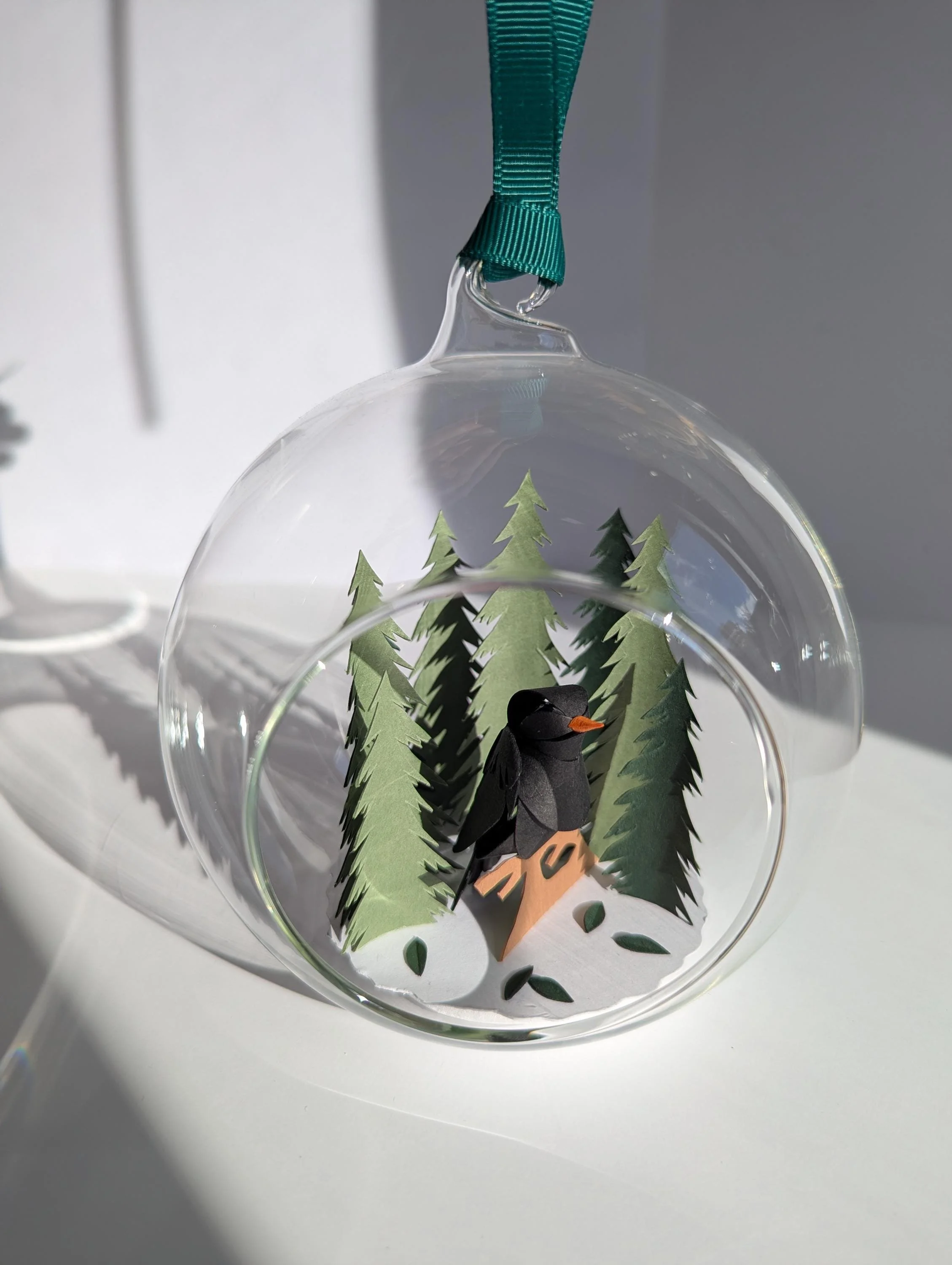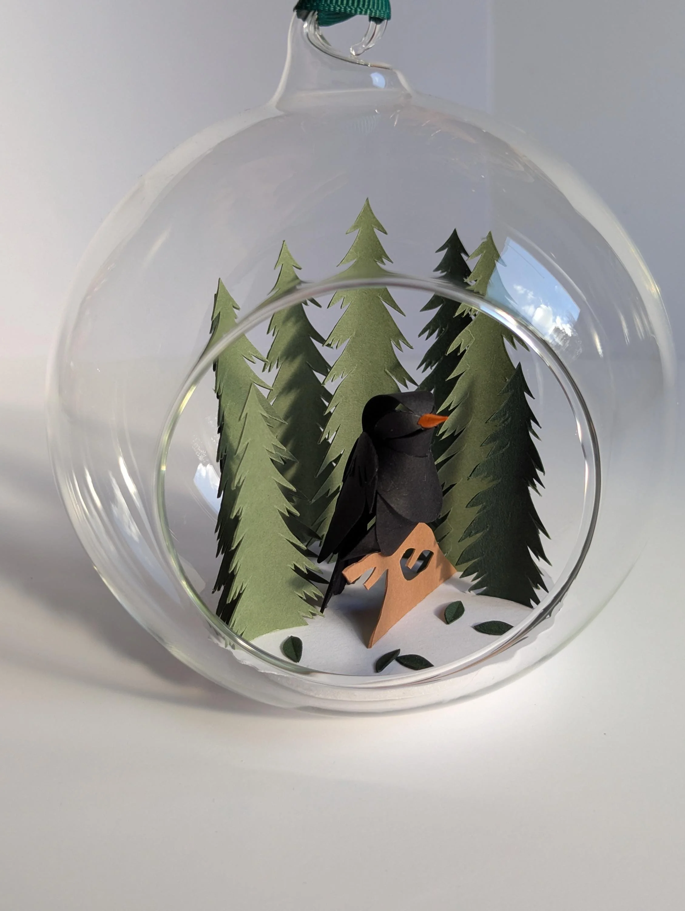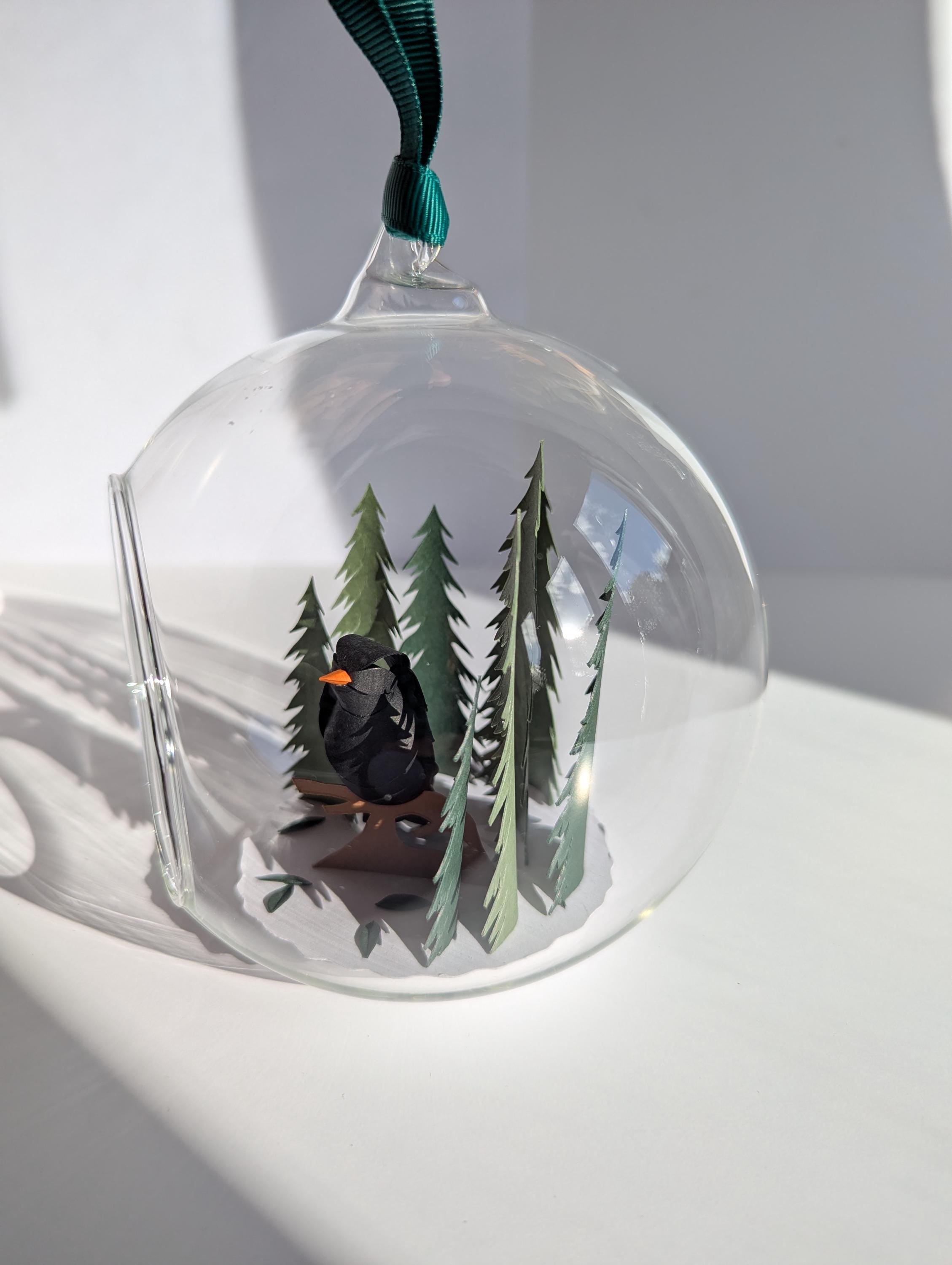 A paper blackbird perched by a fur forest, inside a slightly larger glass bauble, 12cm in diameter.