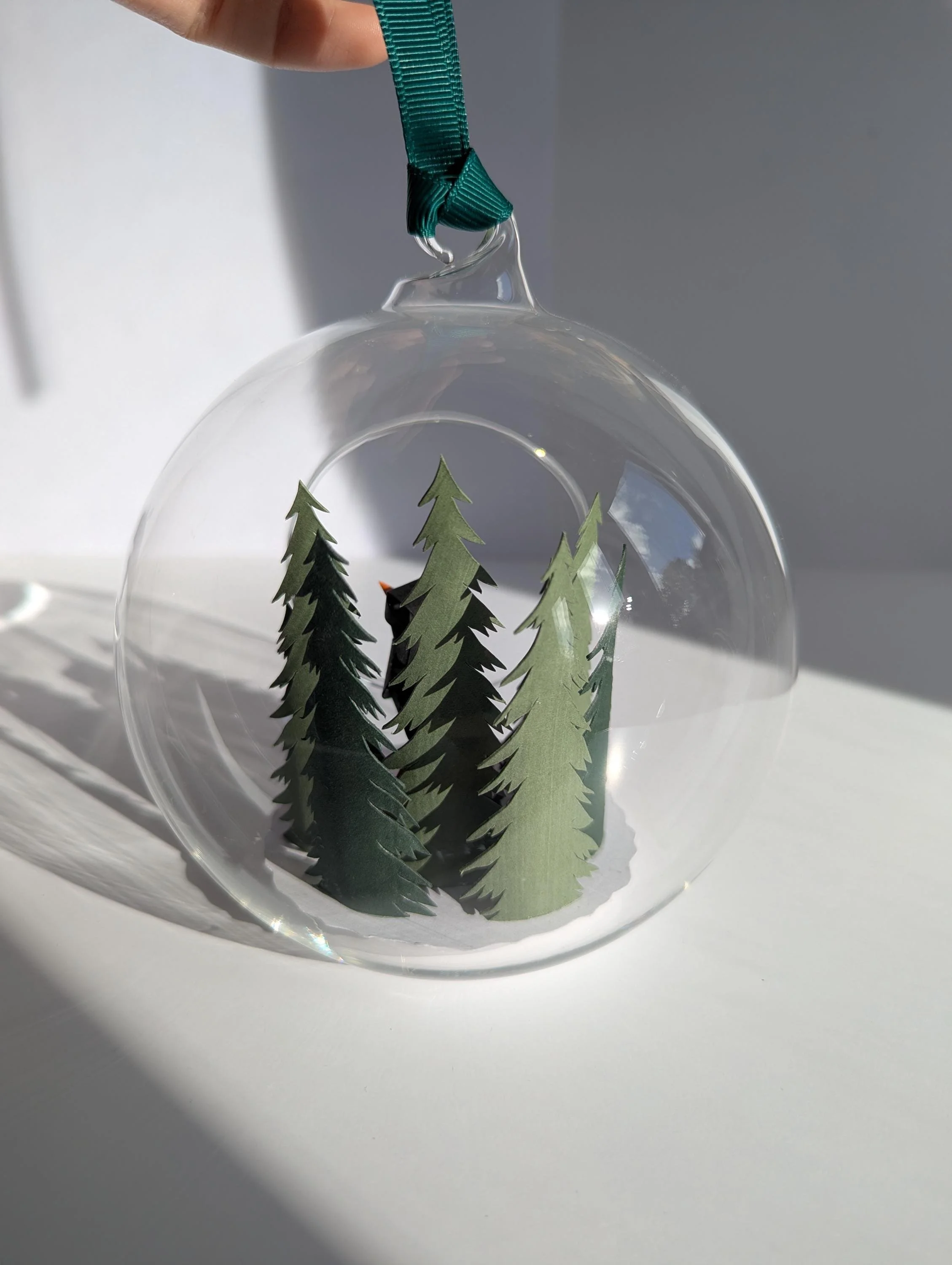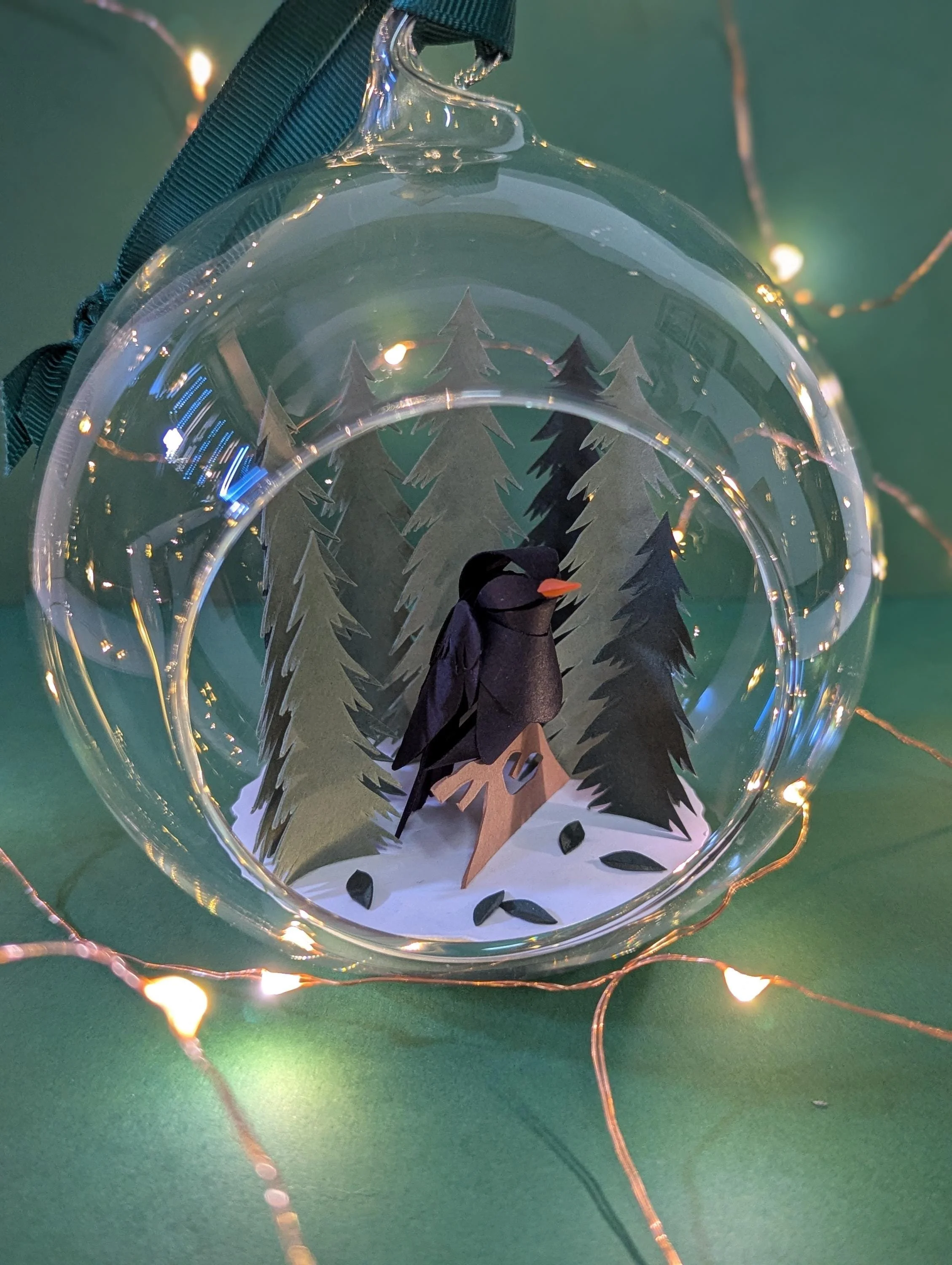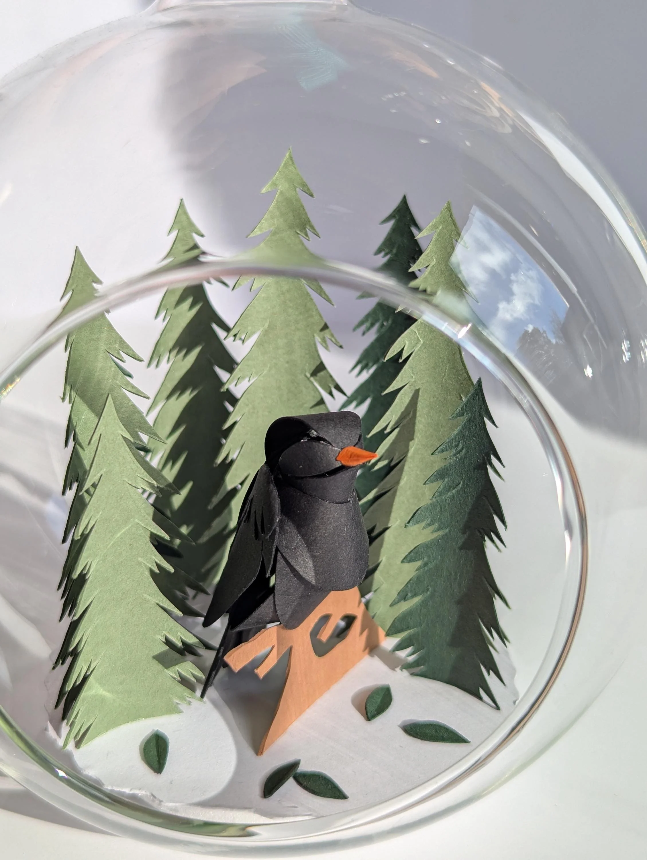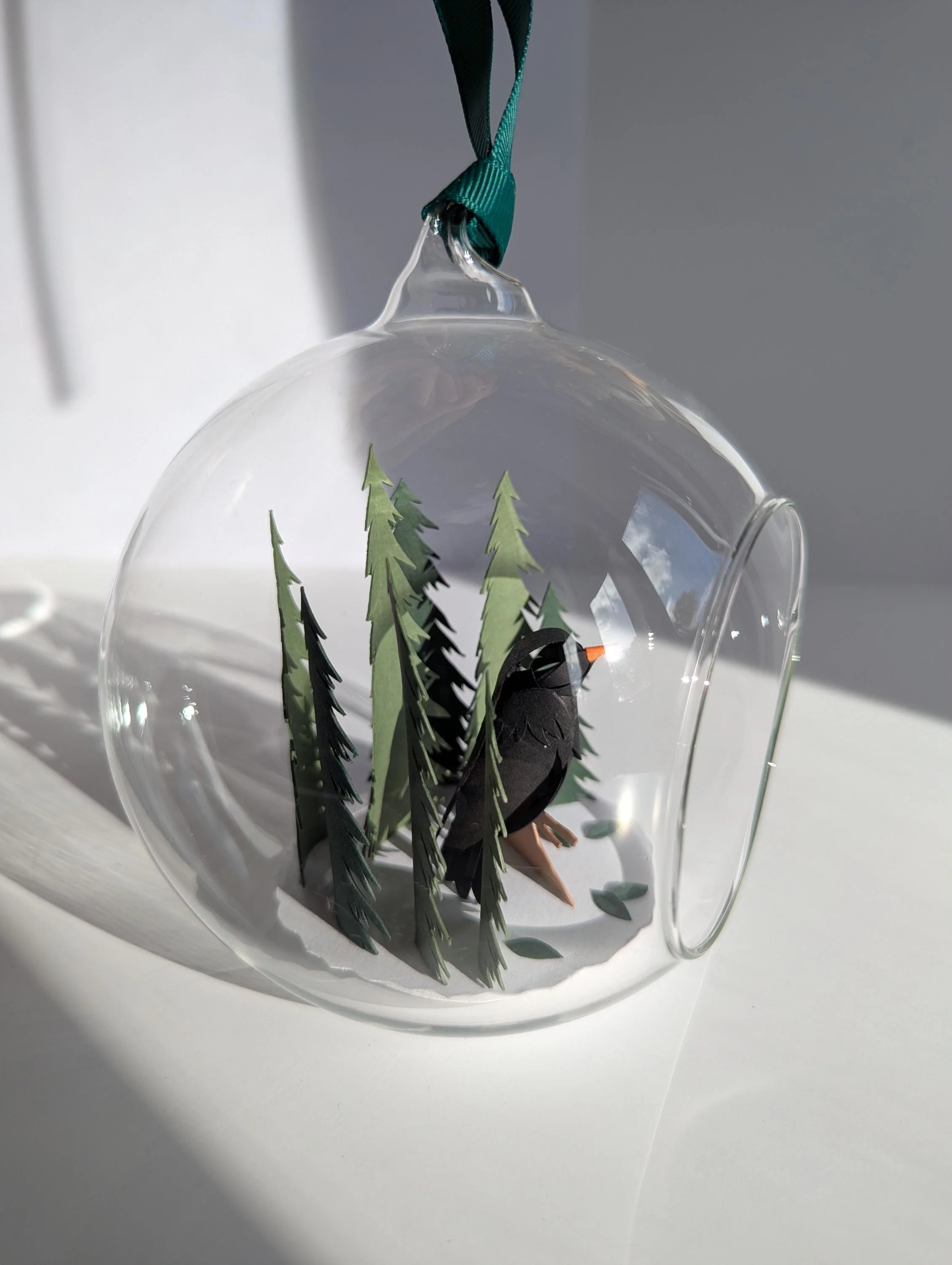 A paper blackbird perched by a fur forest, inside a slightly larger glass bauble, 12cm in diameter.