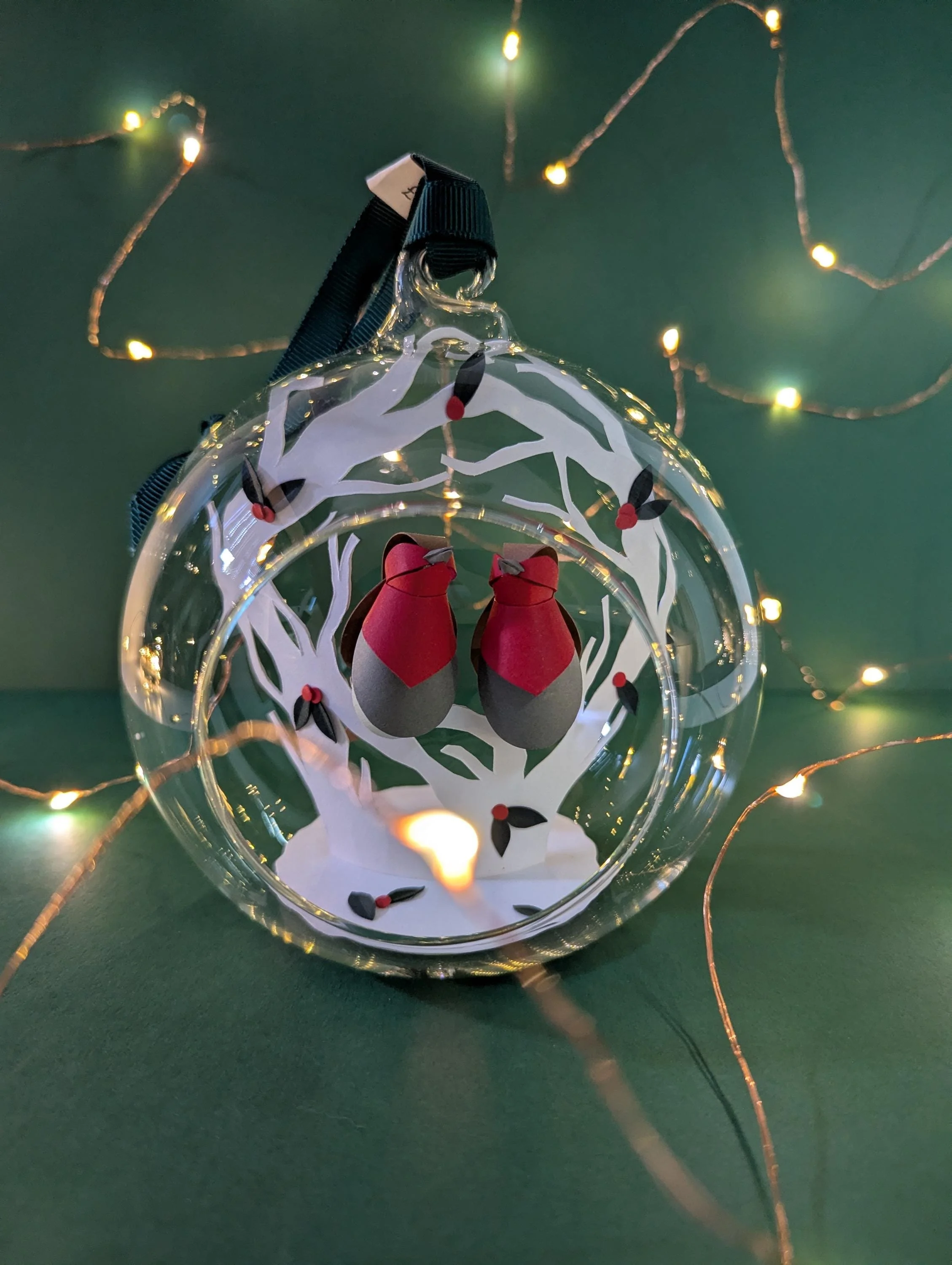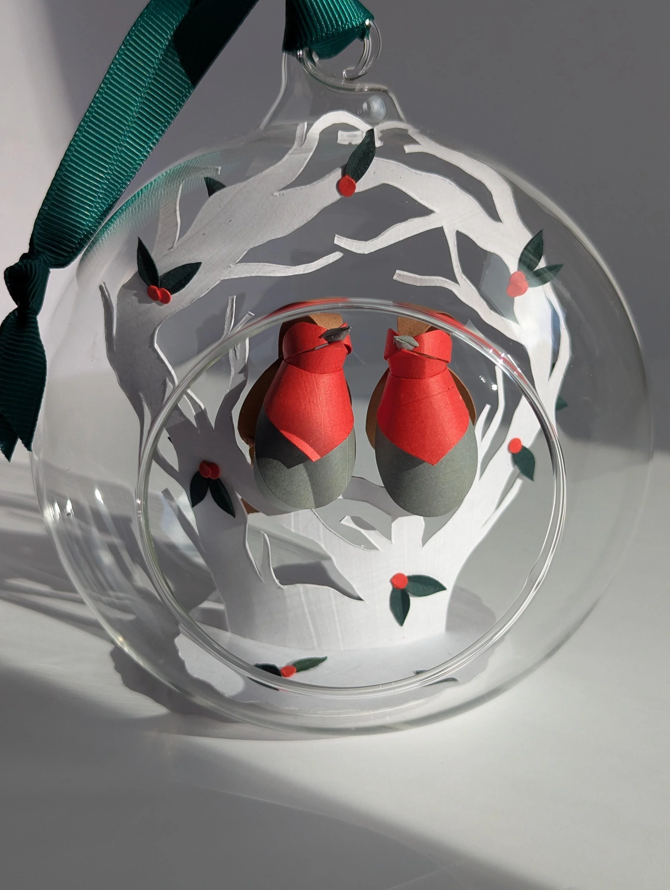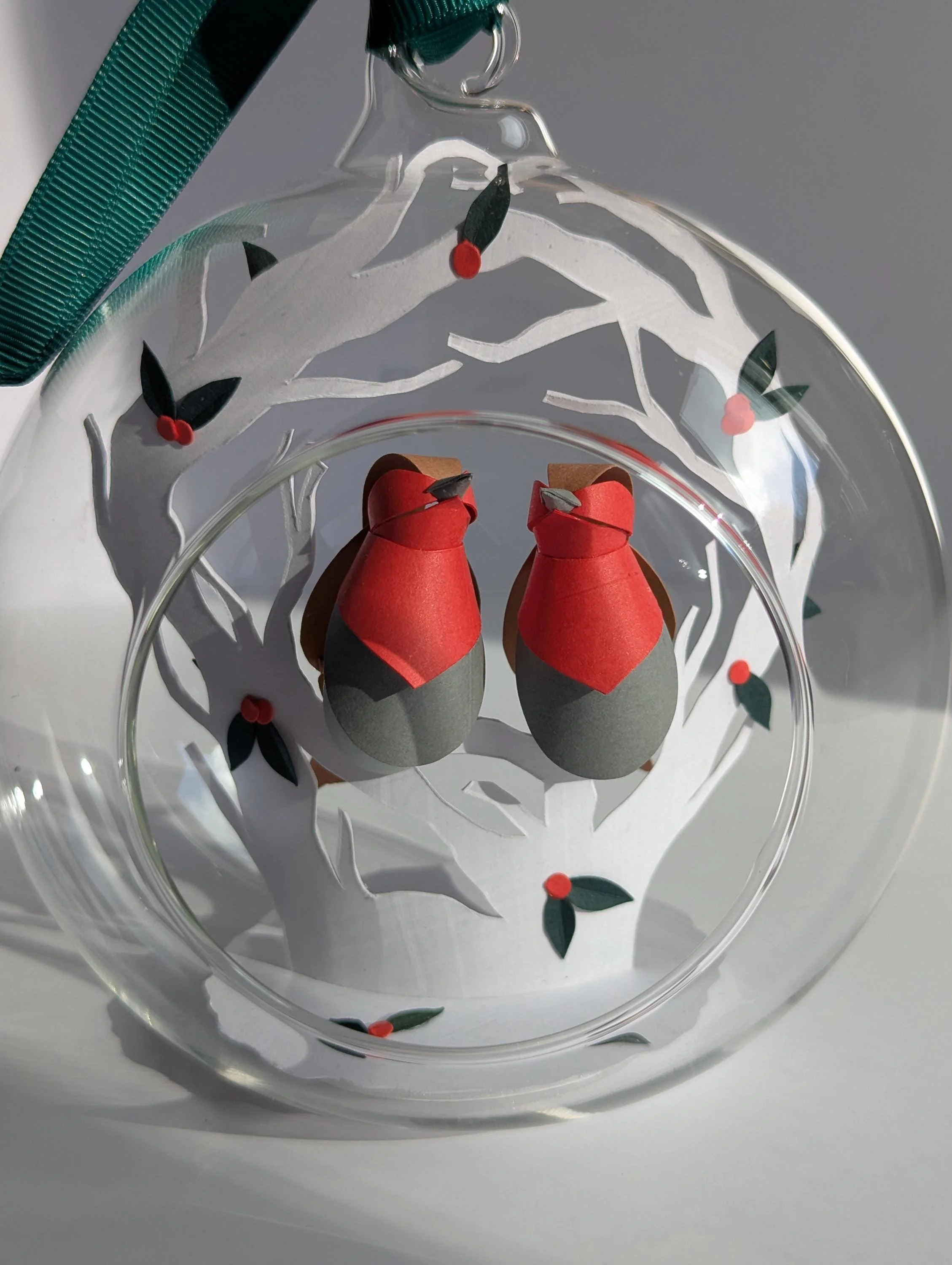 A pair of paper robins, perched amongst snowy branches and berries, inside a slightly larger glass bauble, 12cm in diameter.