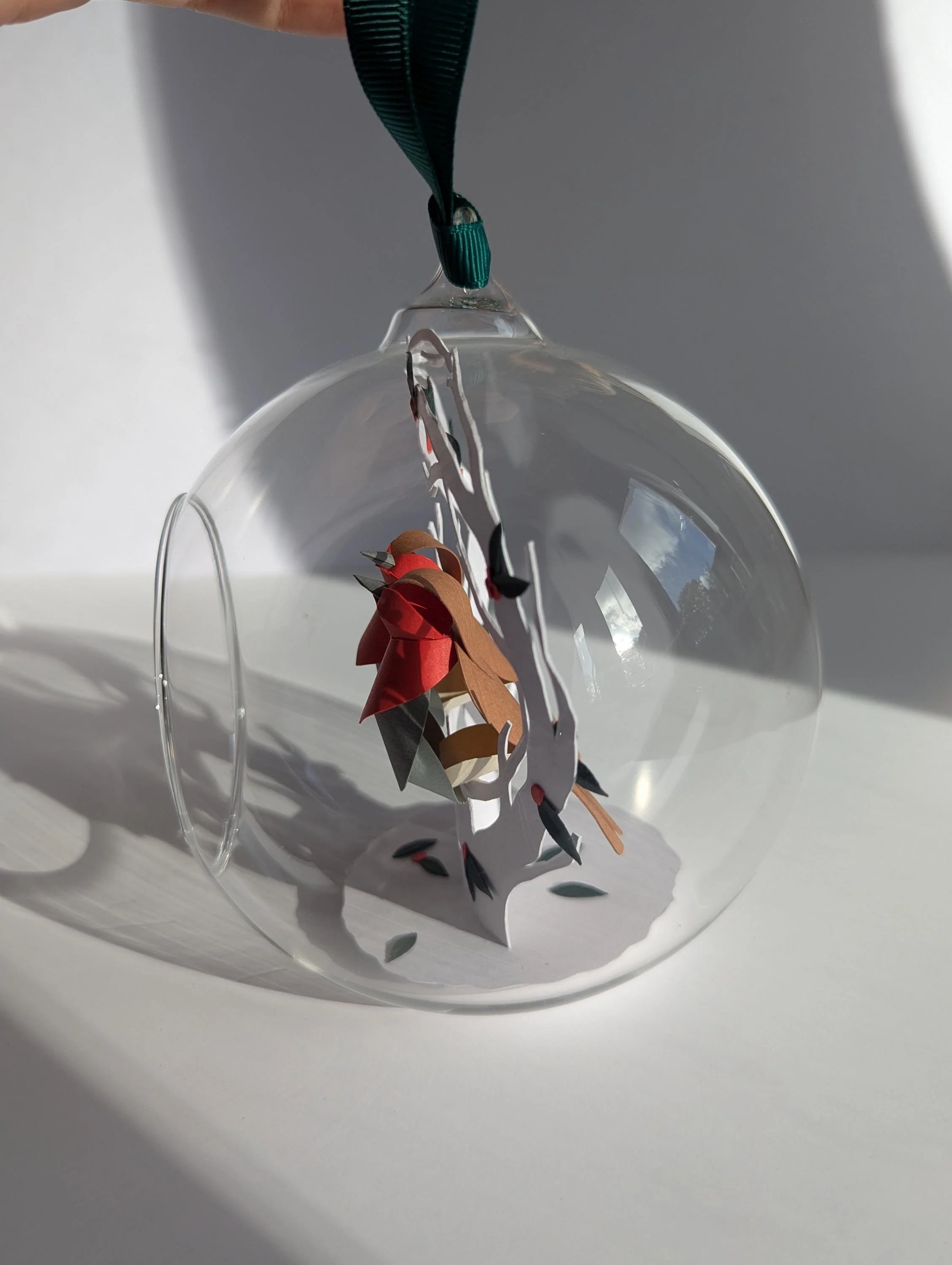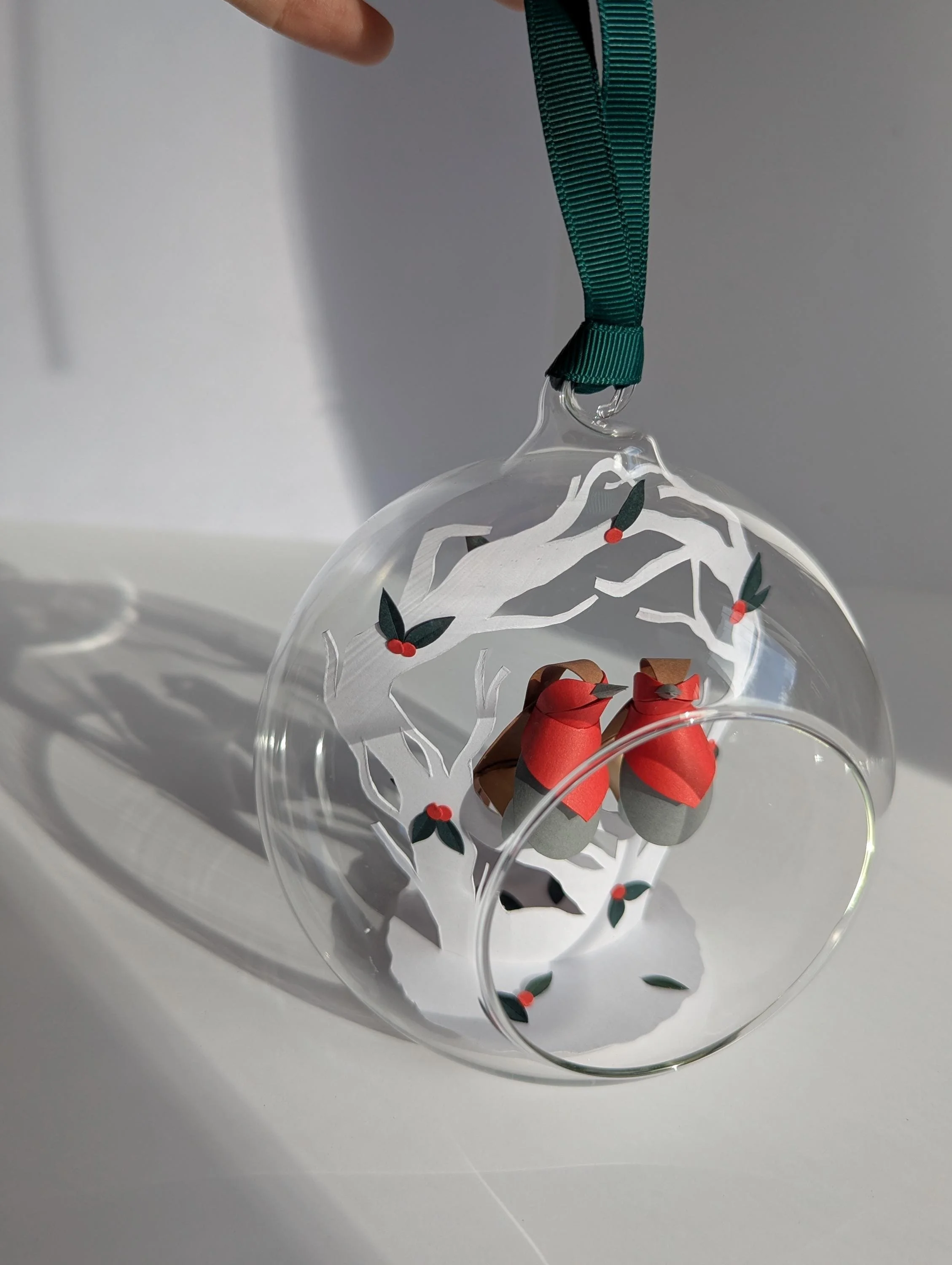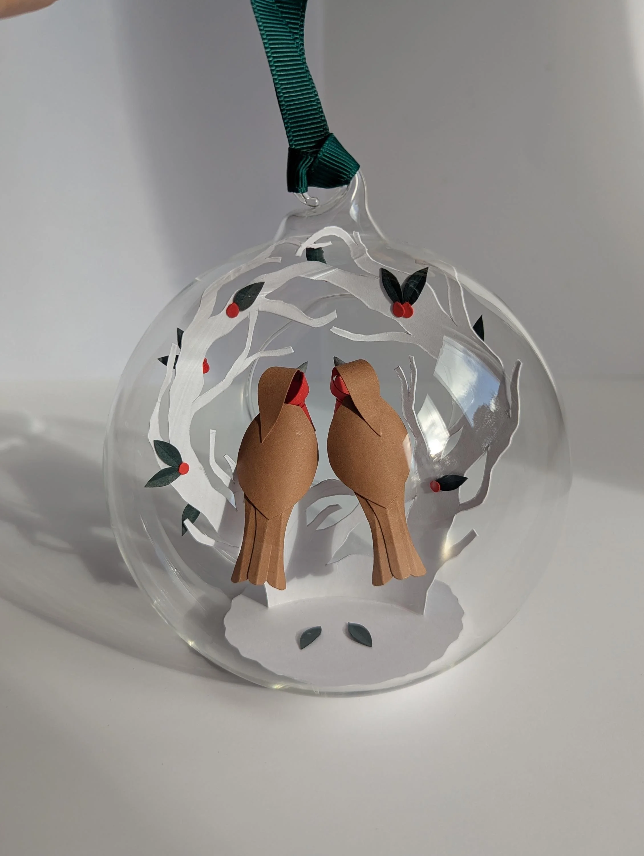 A pair of paper robins, perched amongst snowy branches and berries, inside a slightly larger glass bauble, 12cm in diameter.