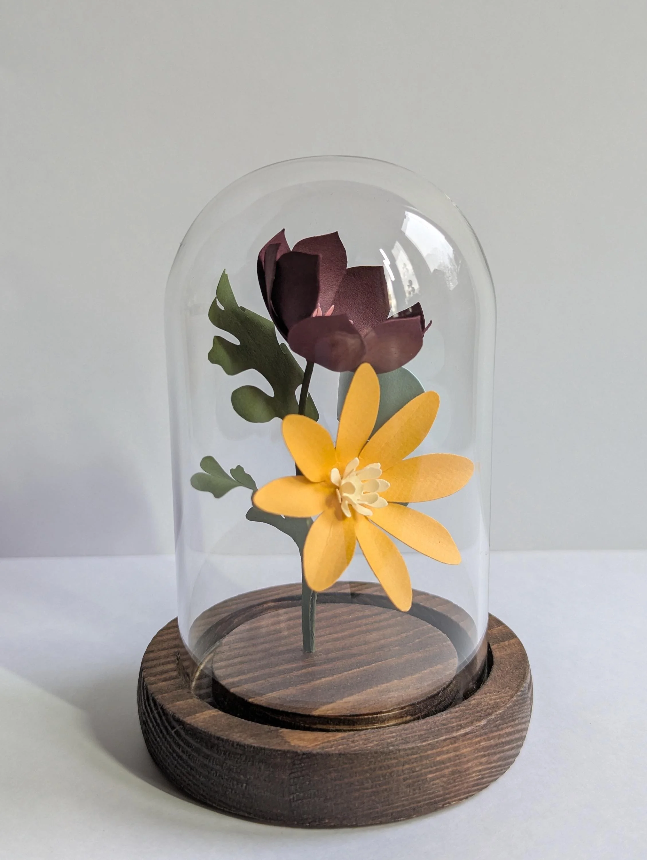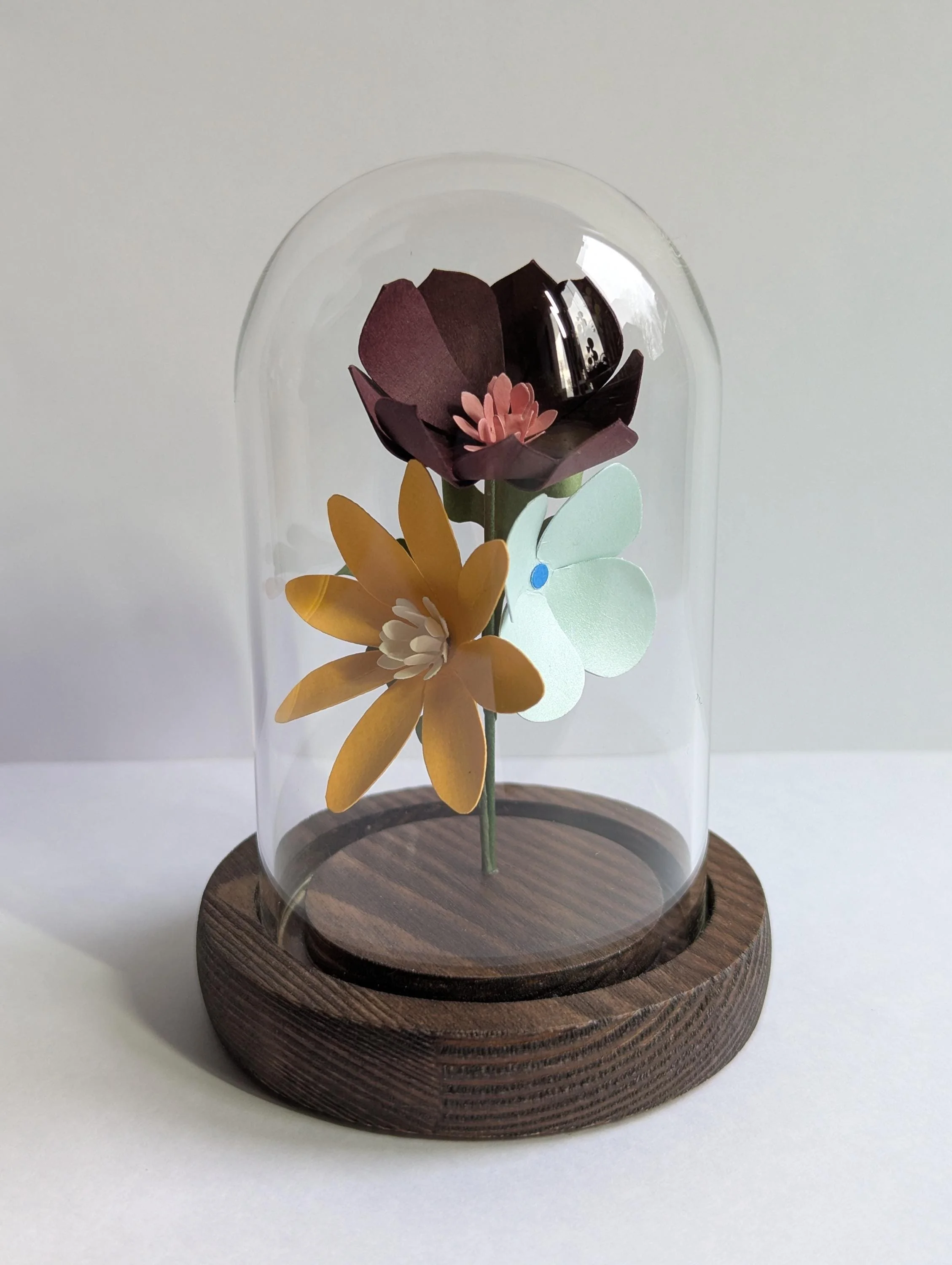 A tiny bunch of hand crafted paper flowers encased inside a small glass bell jar with a hand stained wooden base.