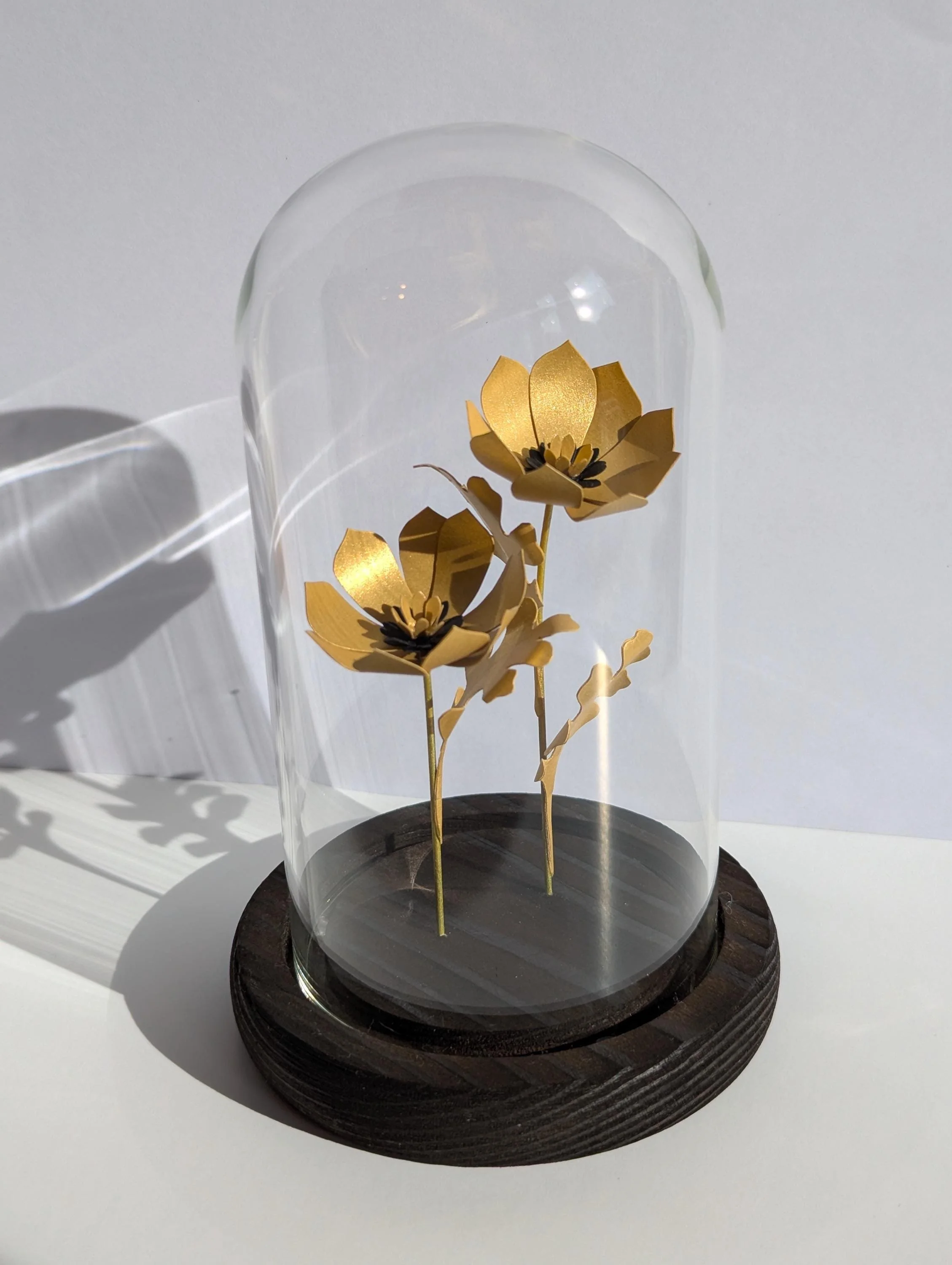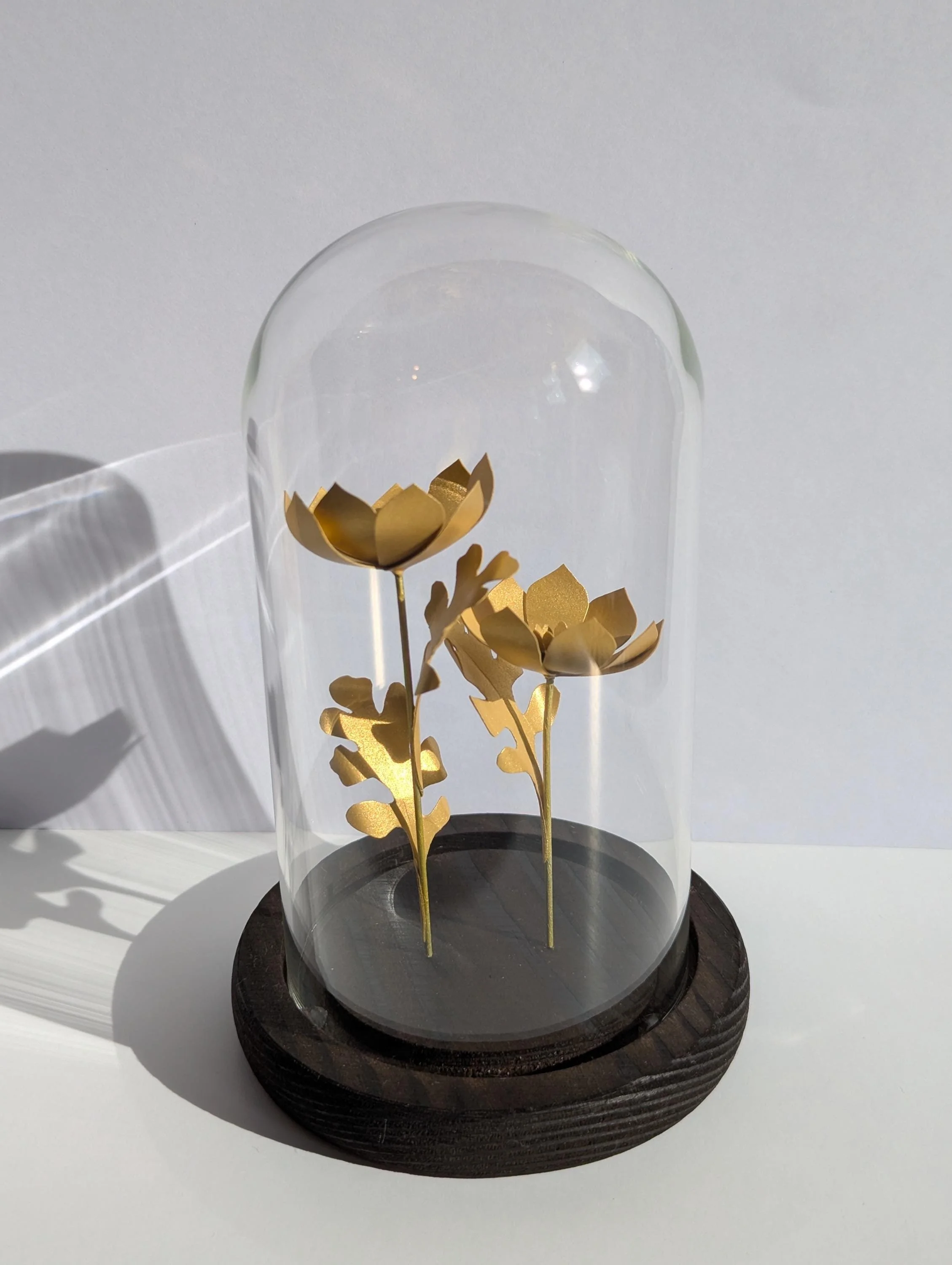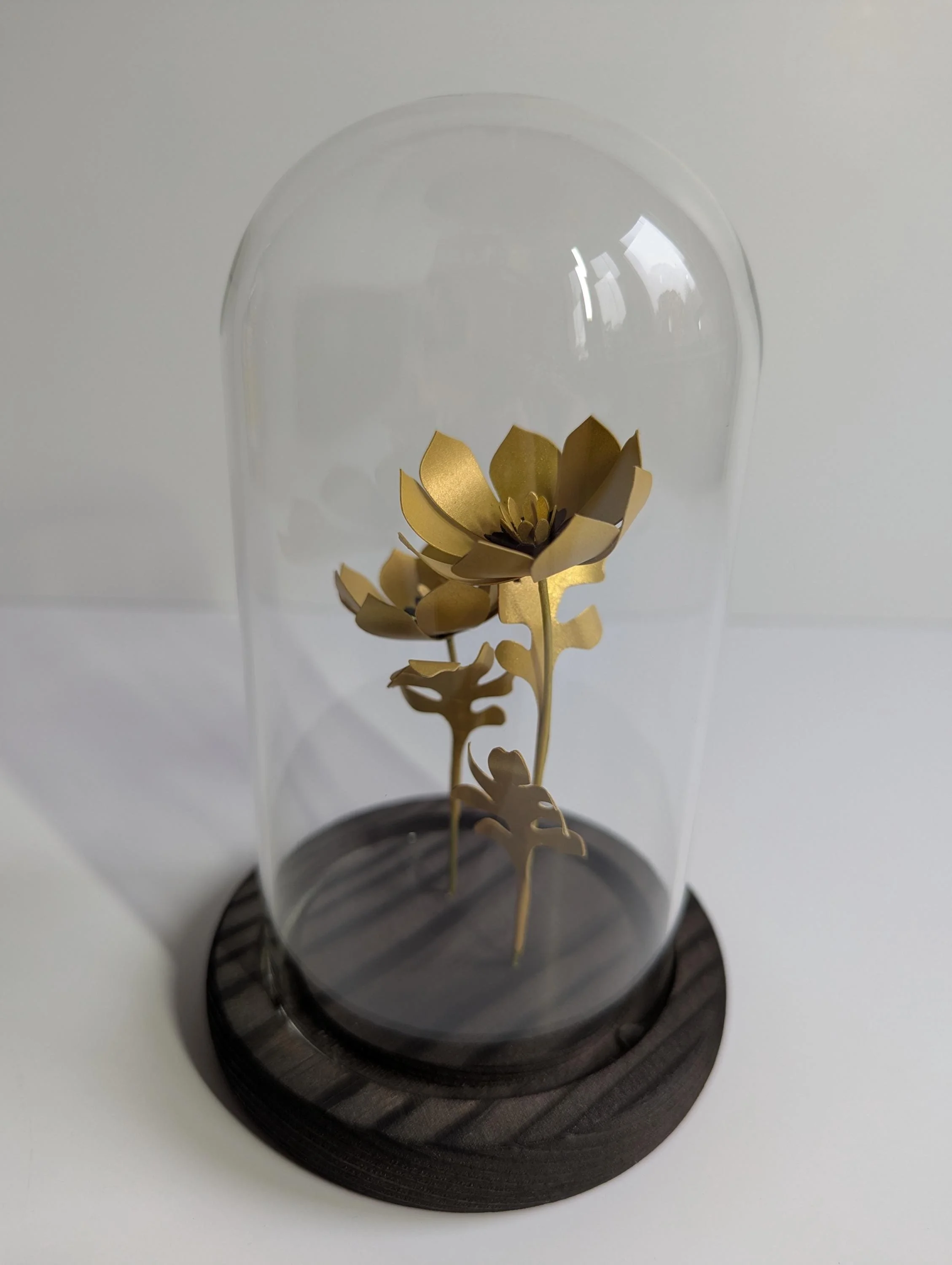 Two hand crafted golden paper flowers encased inside a small glass bell jar with a hand stained wooden base.