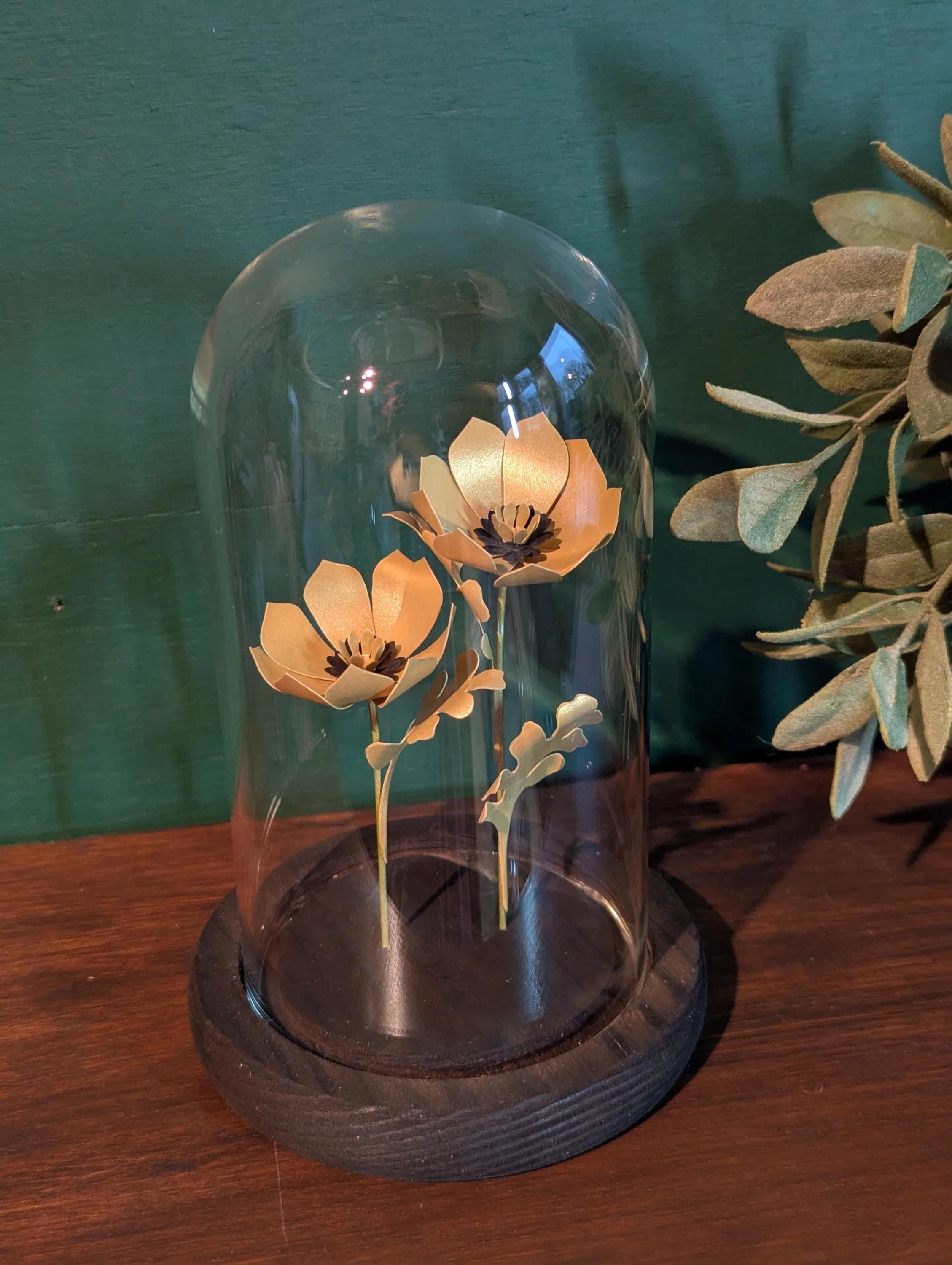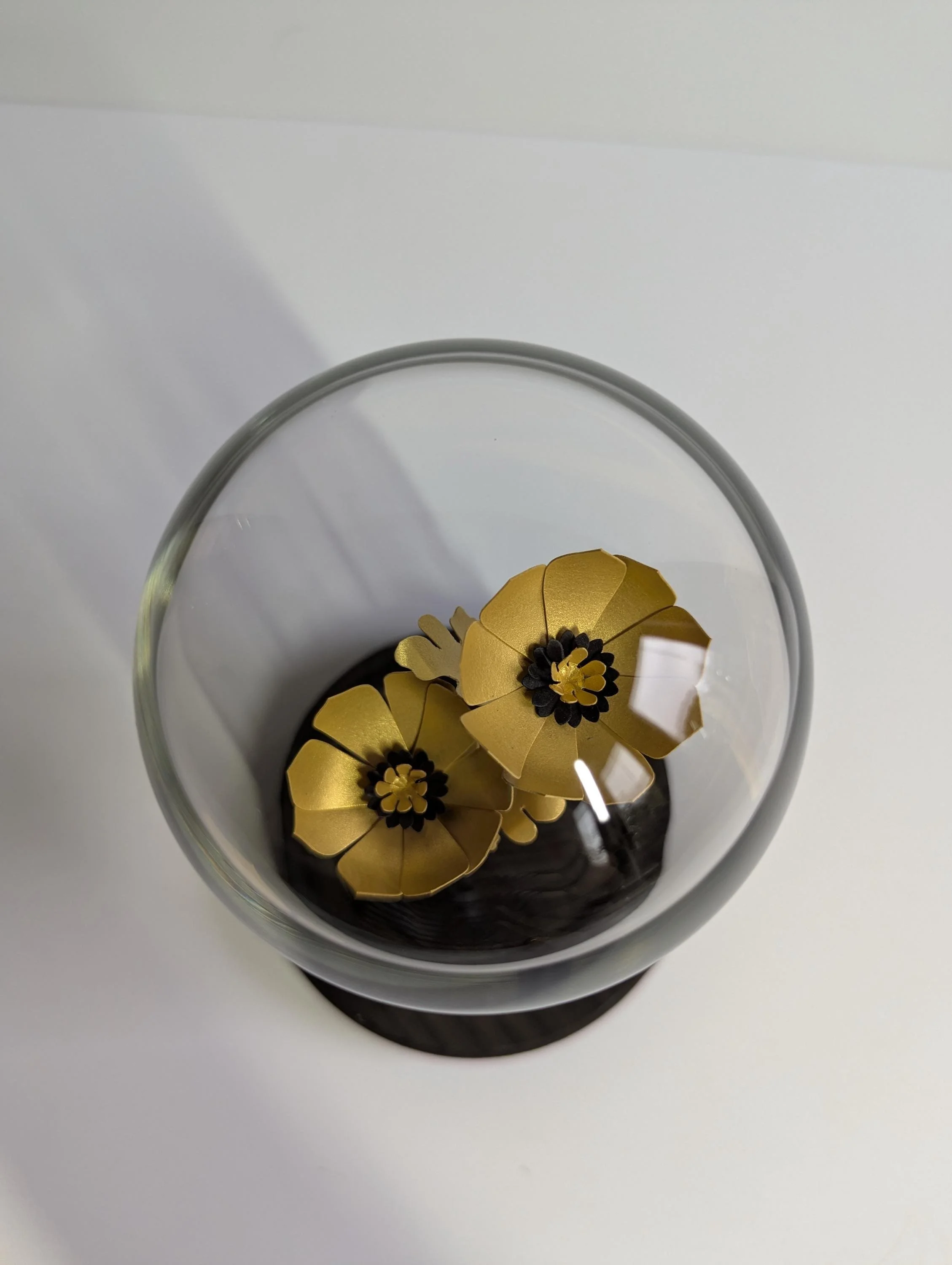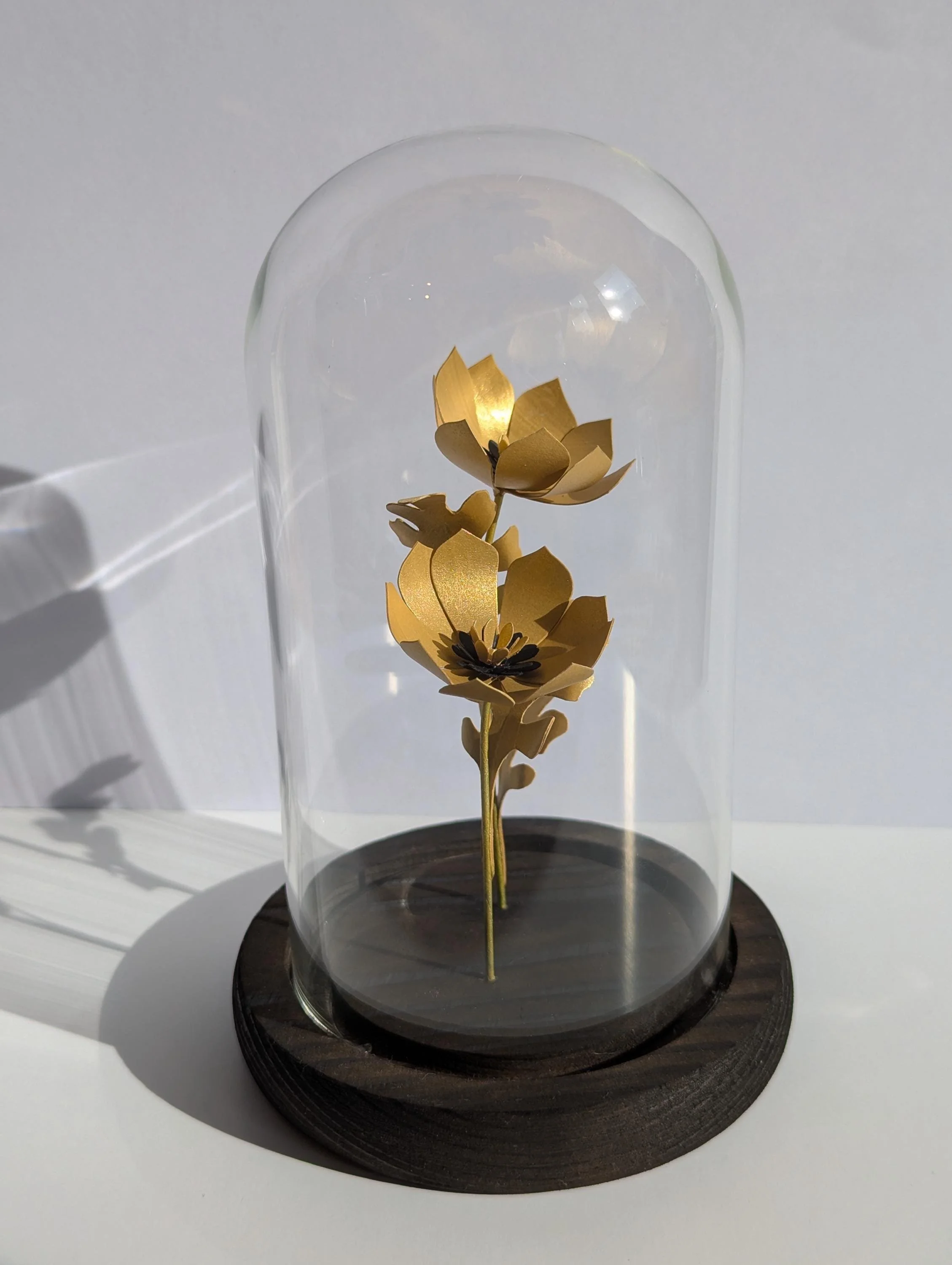 Two hand crafted golden paper flowers encased inside a small glass bell jar with a hand stained wooden base.