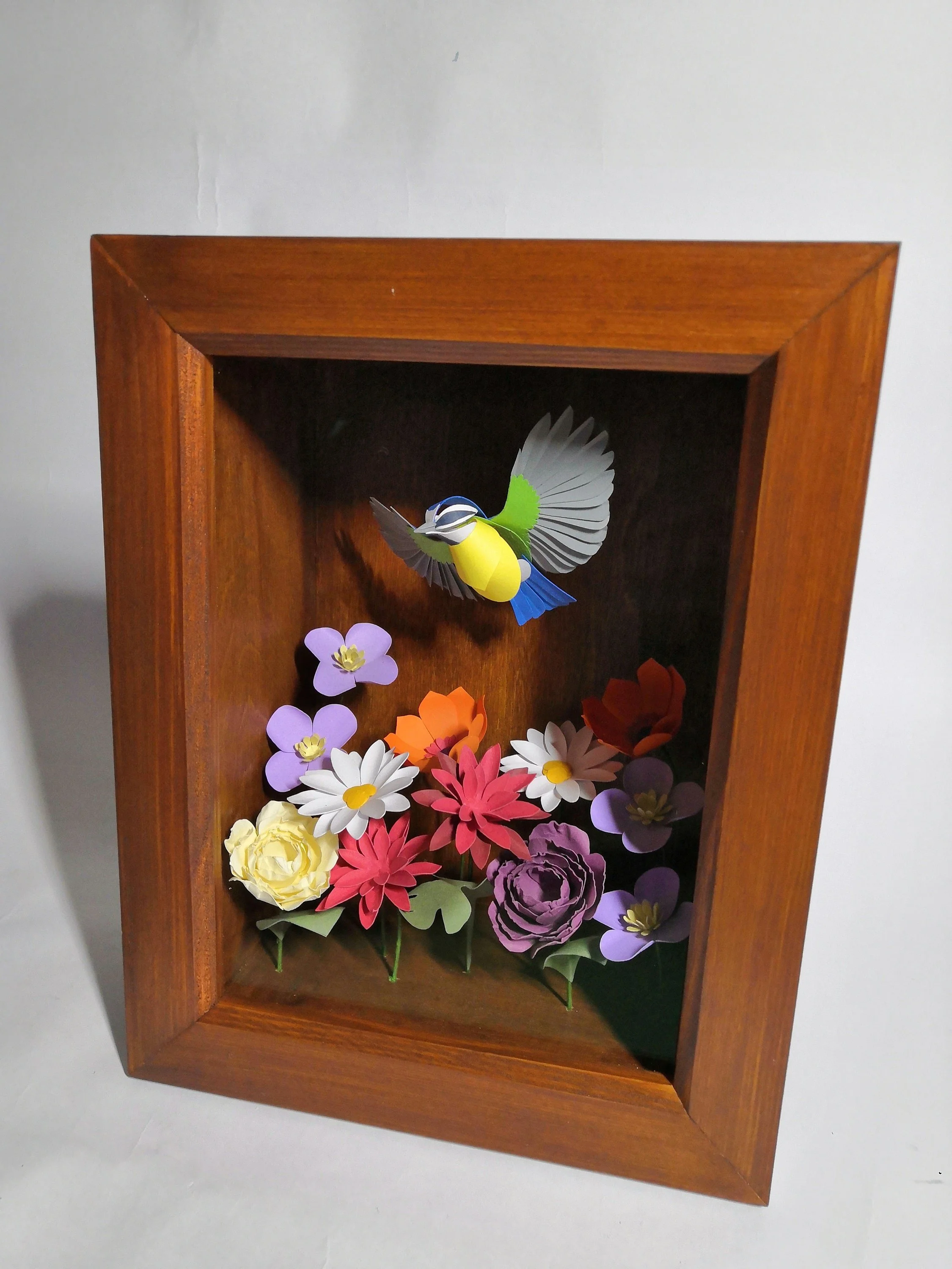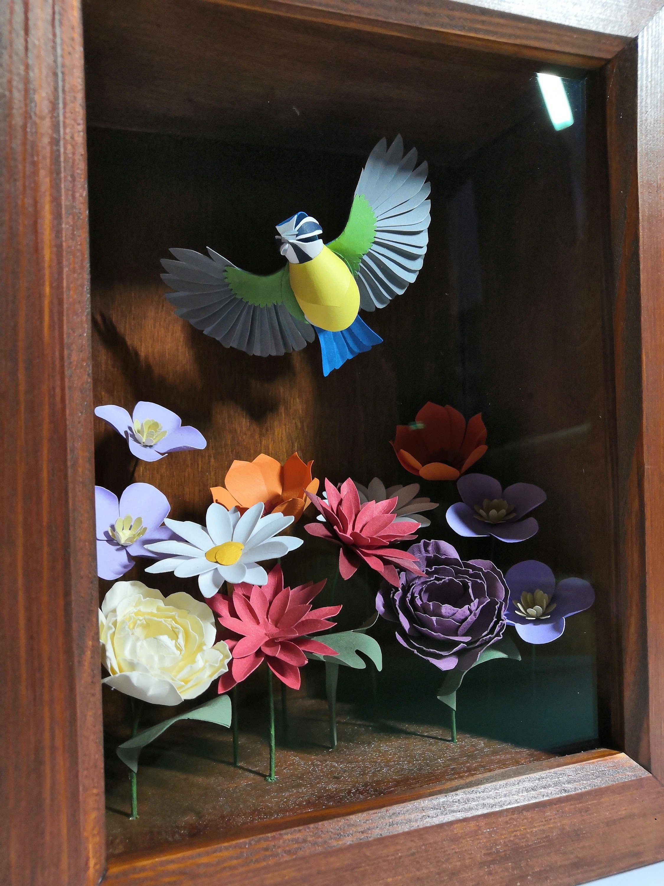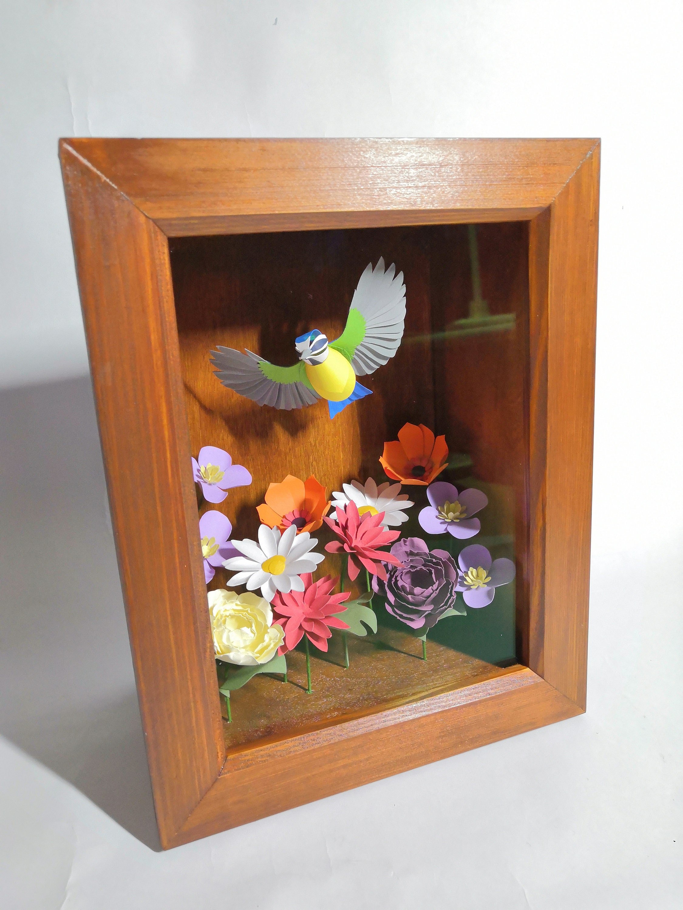 Shop › BloomTit. Framed Paper-cut Bluetit over Flowers Image 1 of 6 Image 2 of 6 Image 3 of 6 Image 4 of 6 Image 5 of 6 Image 6 of 6 BloomTit. Framed Paper-cut Bluetit over Flowers £380.00 A paper-cut Bluetit captured in flight over colourful blooming paper flowers. Encased inside a hand stained wooden box frame with non-reflective glass.Cruelty free taxidermyThe frame has a mirror plate on the back so it can be wall mounted, or sat on a shelf.All the card has been cut and sculpted by hand.If your country isn't listed as a delivery option, please message me and I'll calculate a shipping quote for you. Add To Cart Added! A paper-cut Bluetit captured in flight over colourful blooming paper flowers. Encased inside a hand stained wooden box frame with non-reflective glass.Cruelty free taxidermyThe frame has a mirror plate on the back so it can be wall mounted, or sat on a shelf.All the card has been cut and sculpted by hand.If your country isn't listed as a delivery option, please message me and I'll calculate a shipping quote for you.