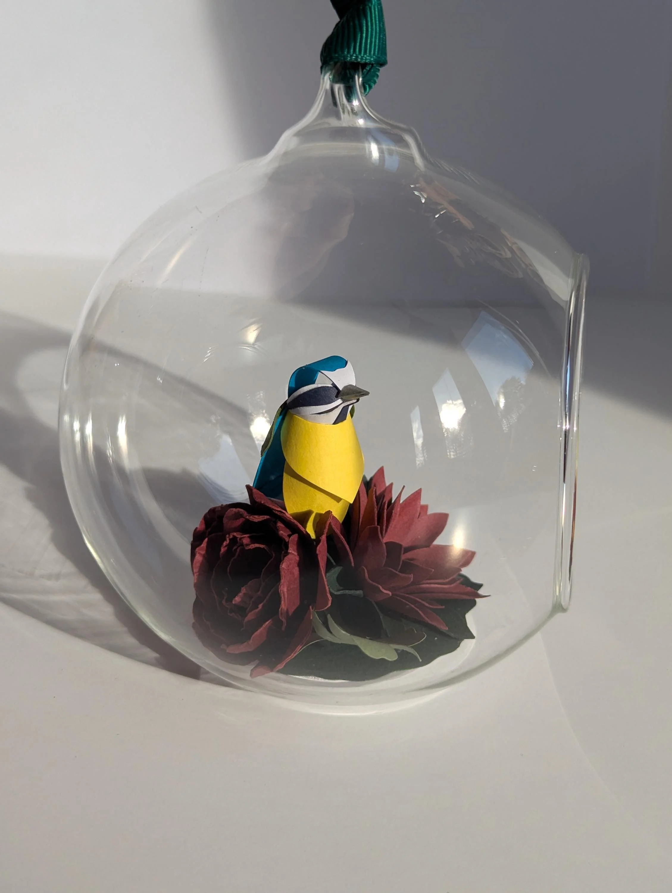 A slightly simplified version of one of my paper Bluetits, perched among paper flowers, inside a 10cm glass bauble.