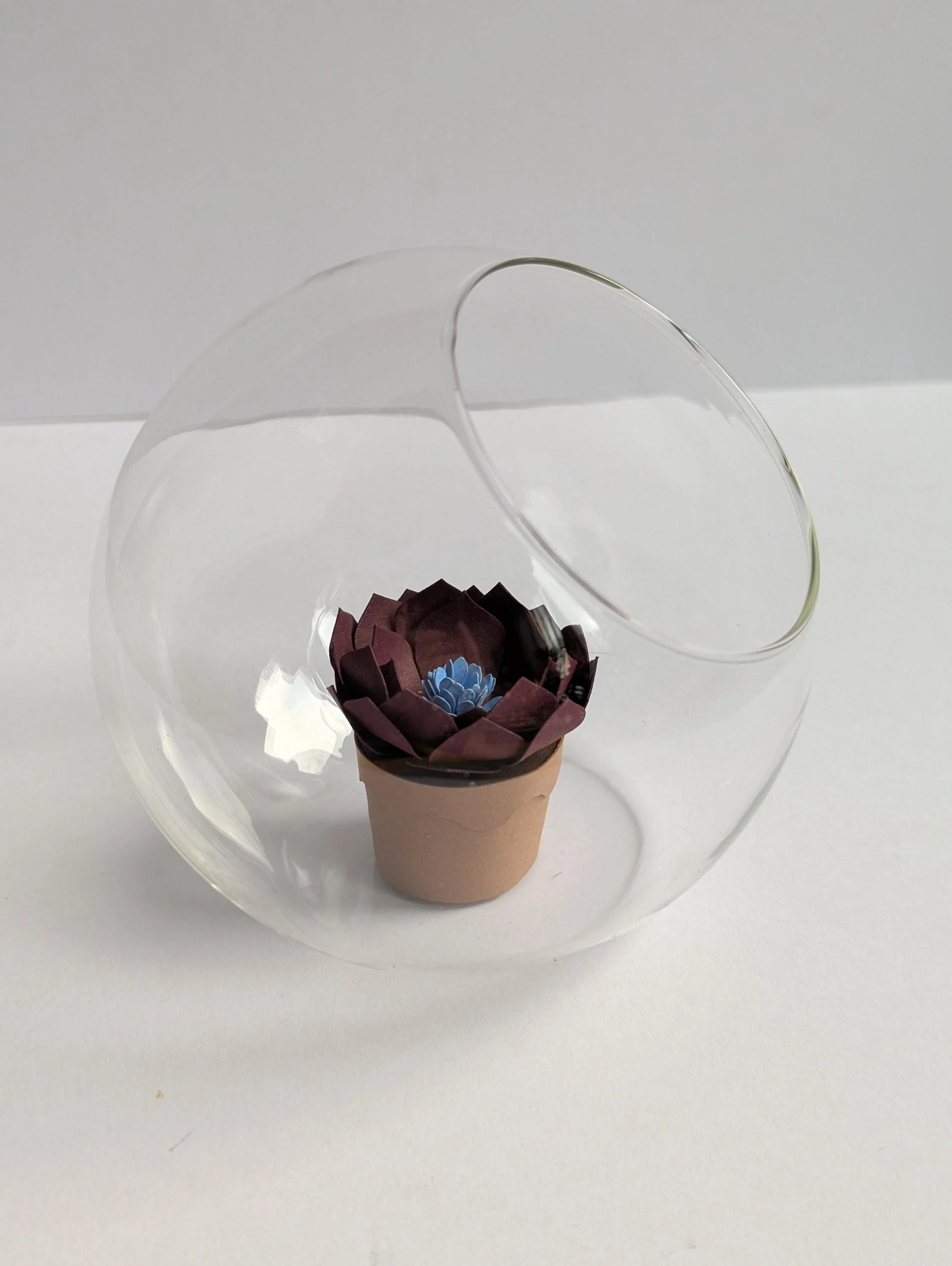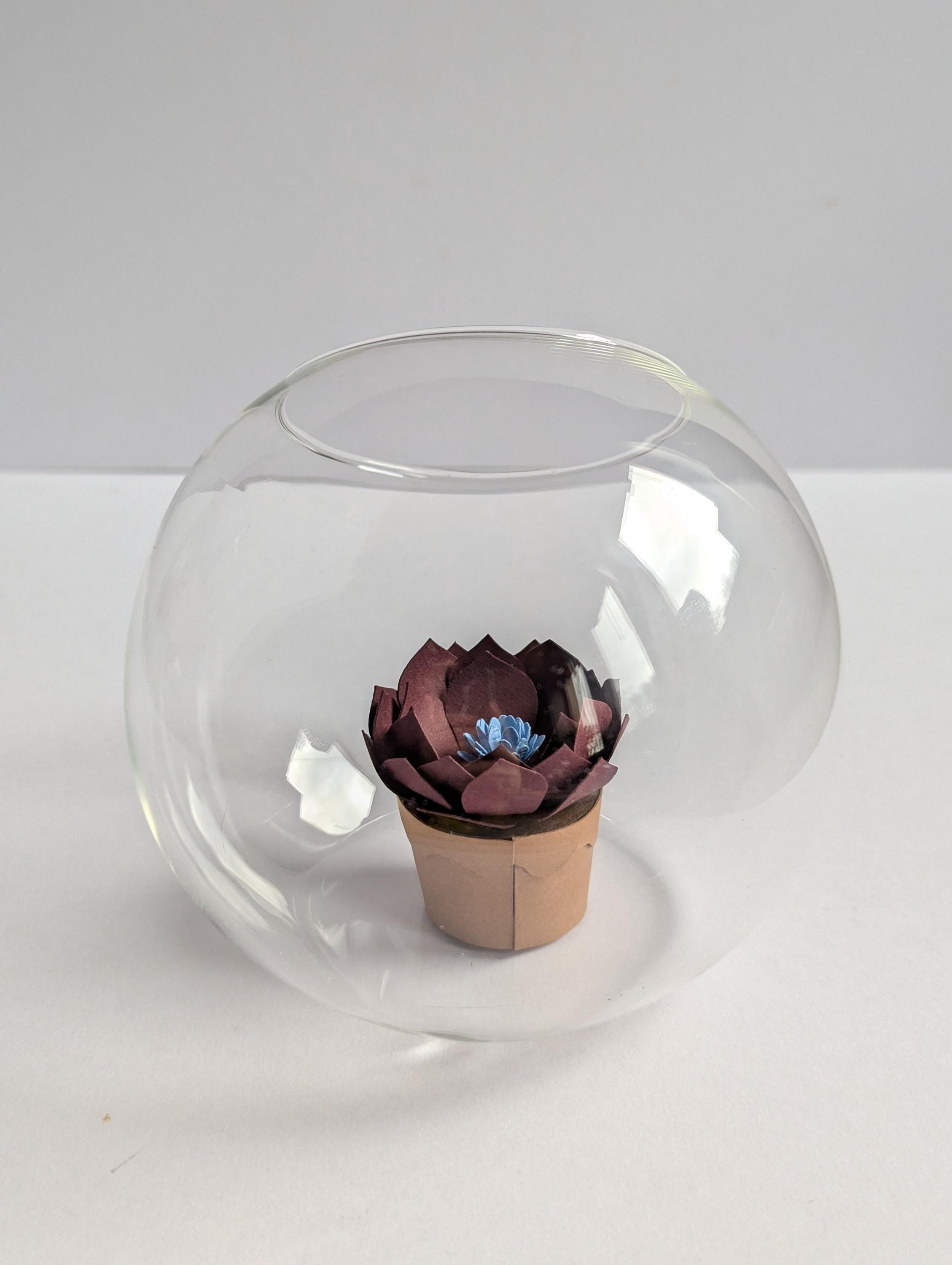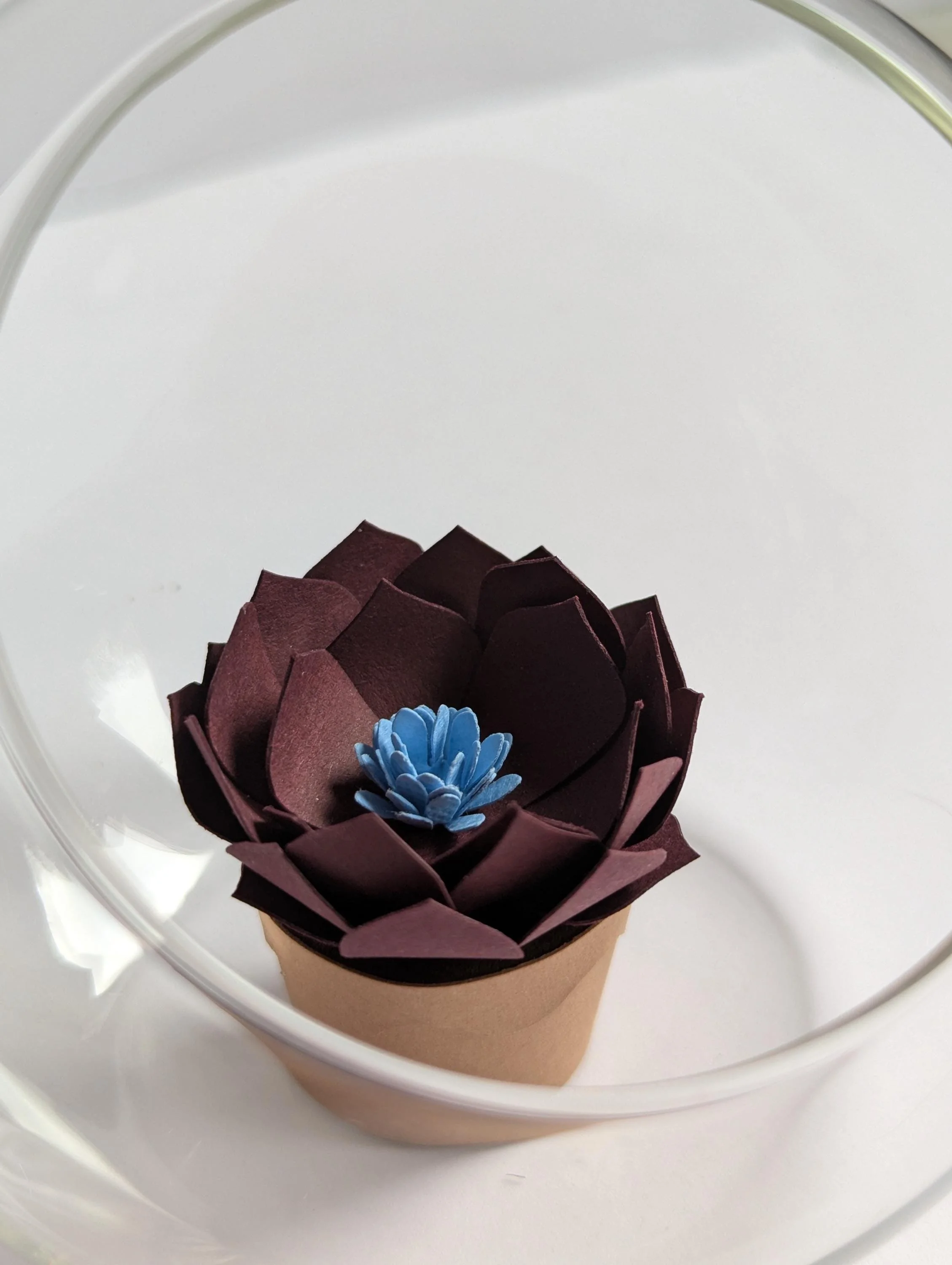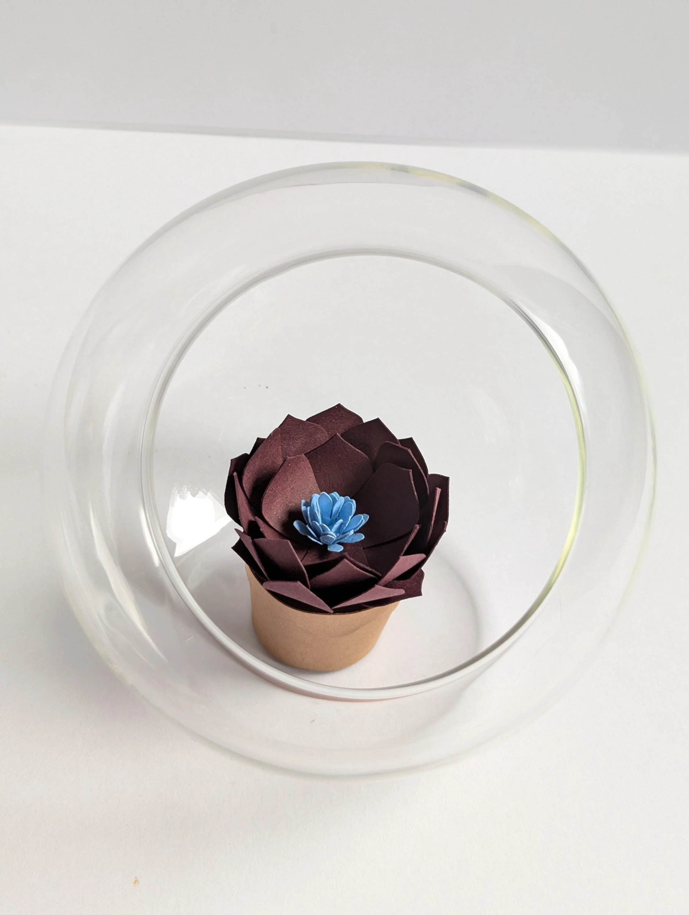 A hand crafted paper flower encased inside a small glass bell jar with a hand stained wooden base.