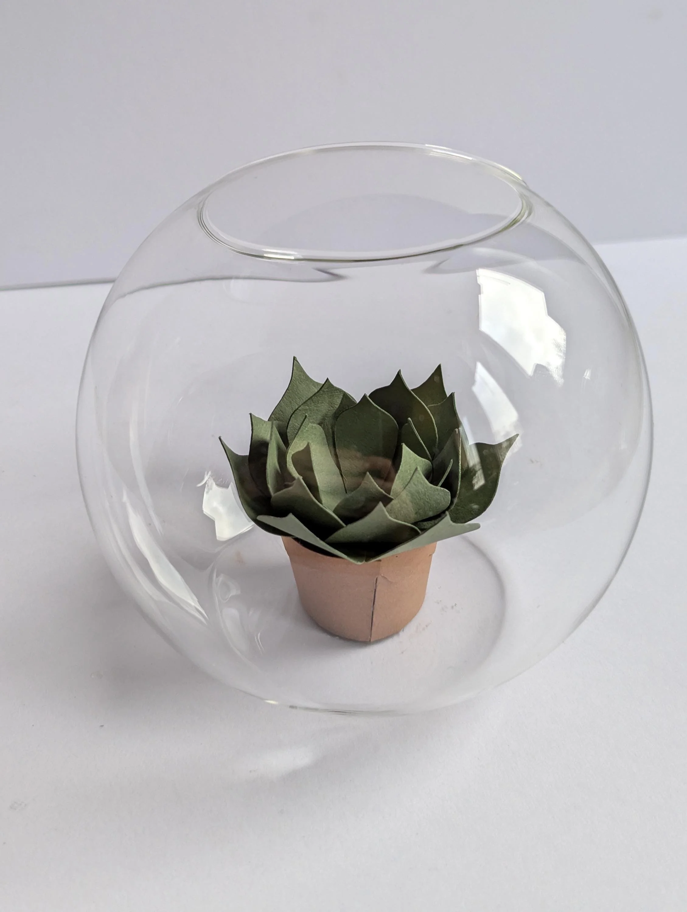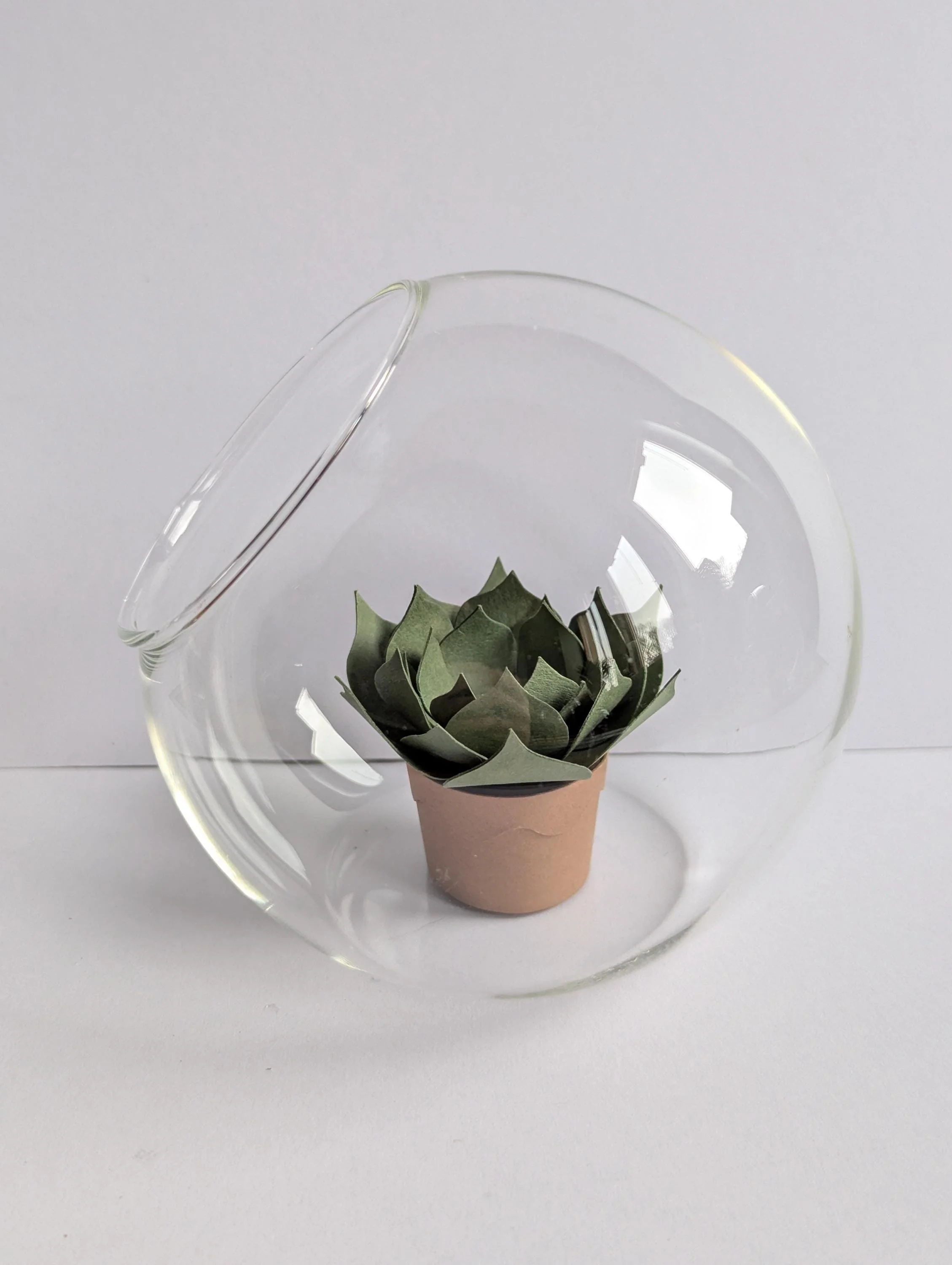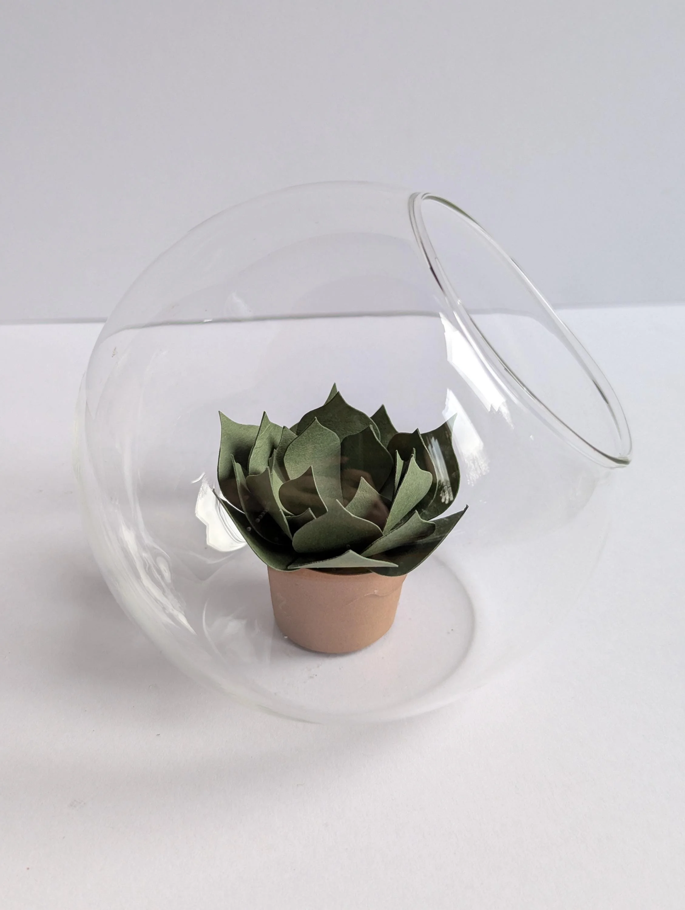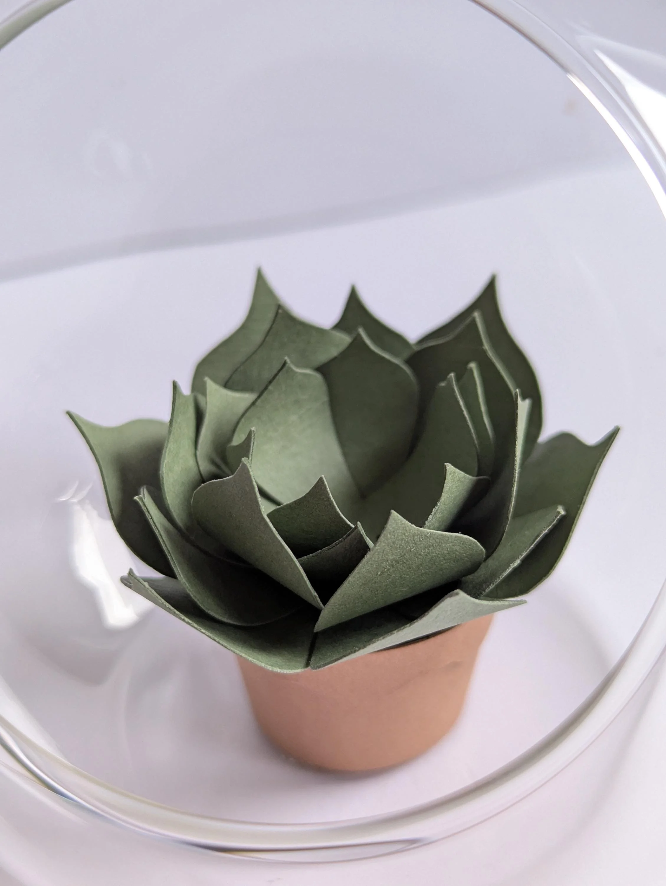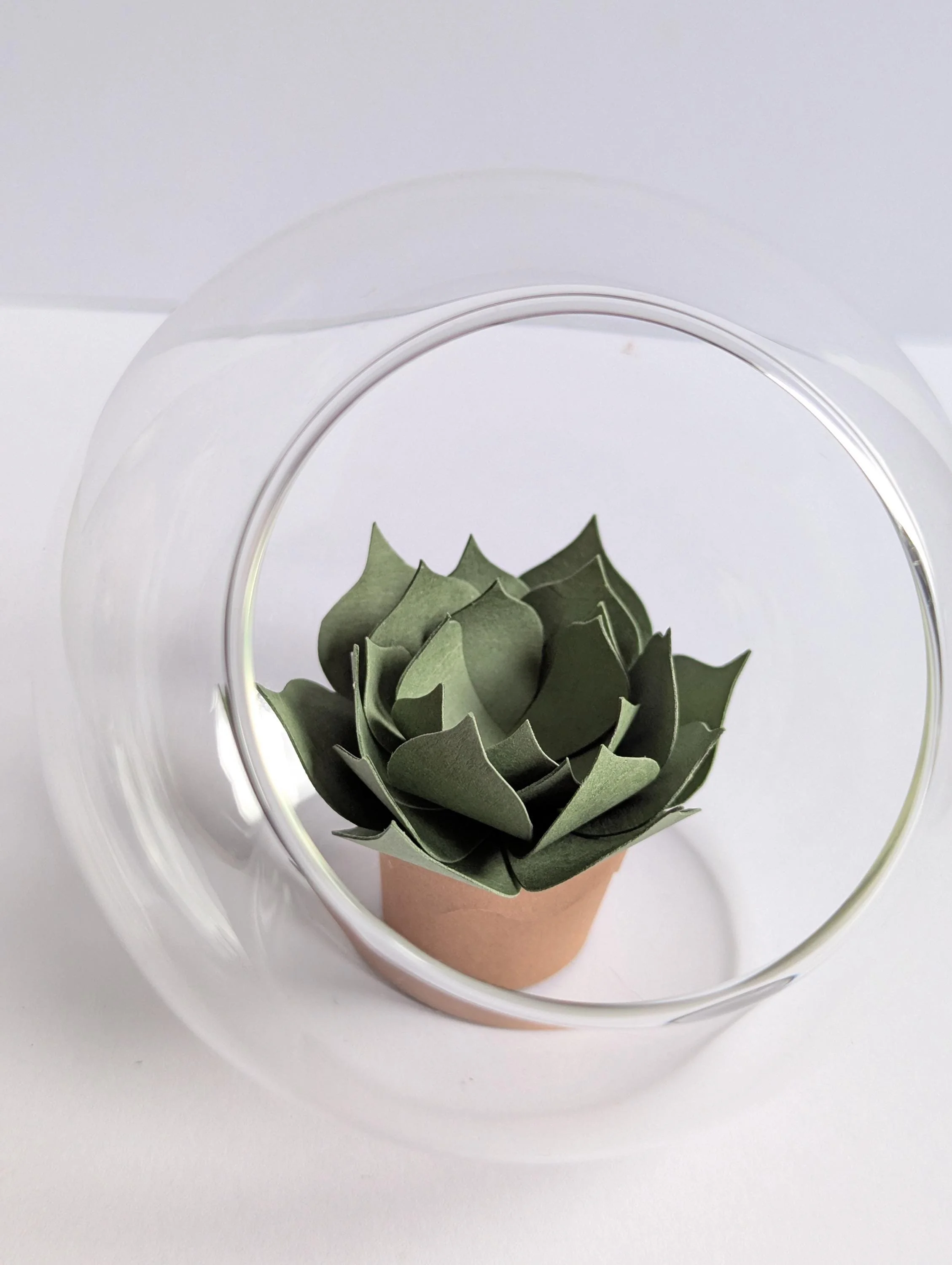 A hand crafted paper flower encased inside a small glass bell jar with a hand stained wooden base.