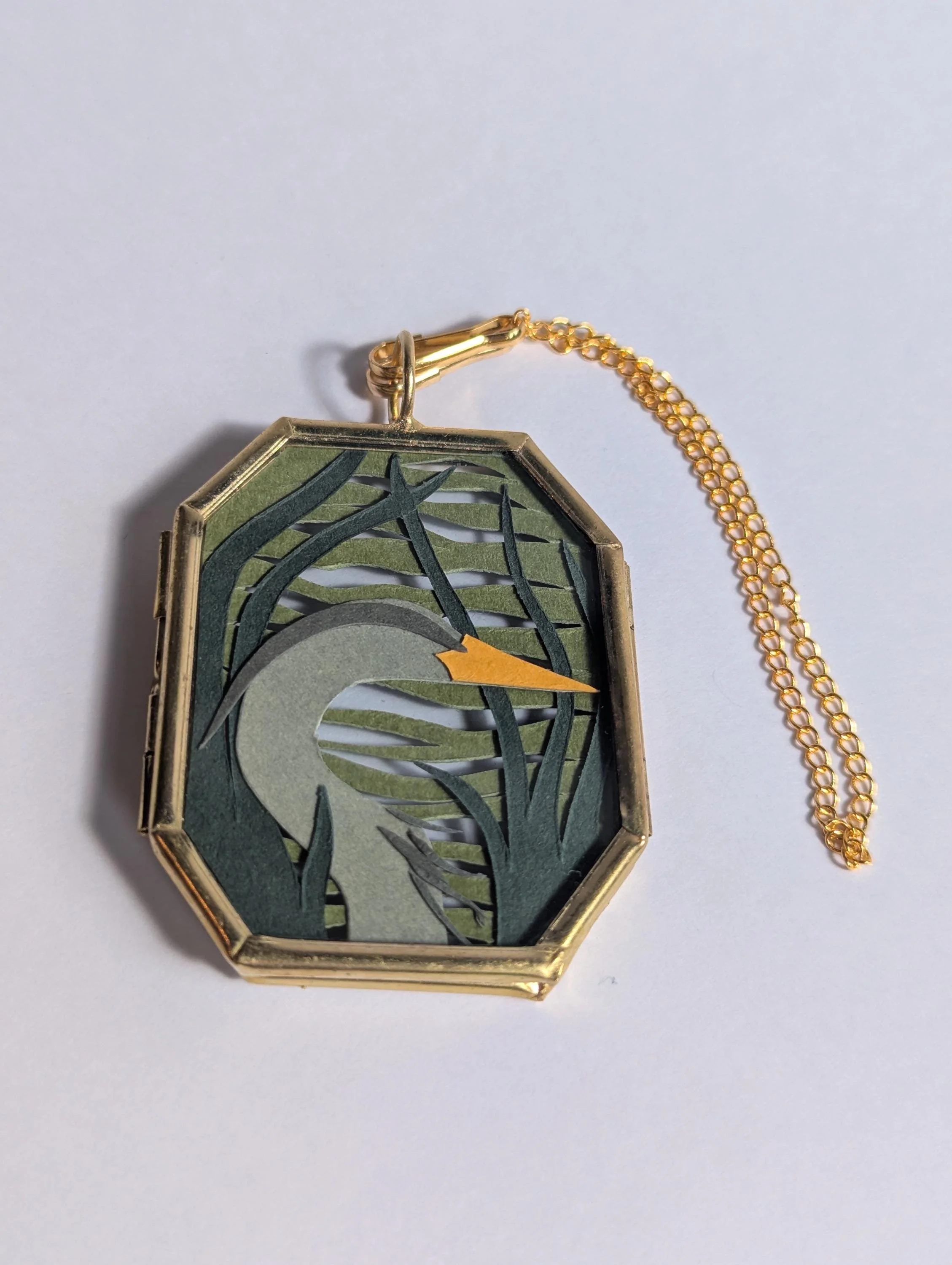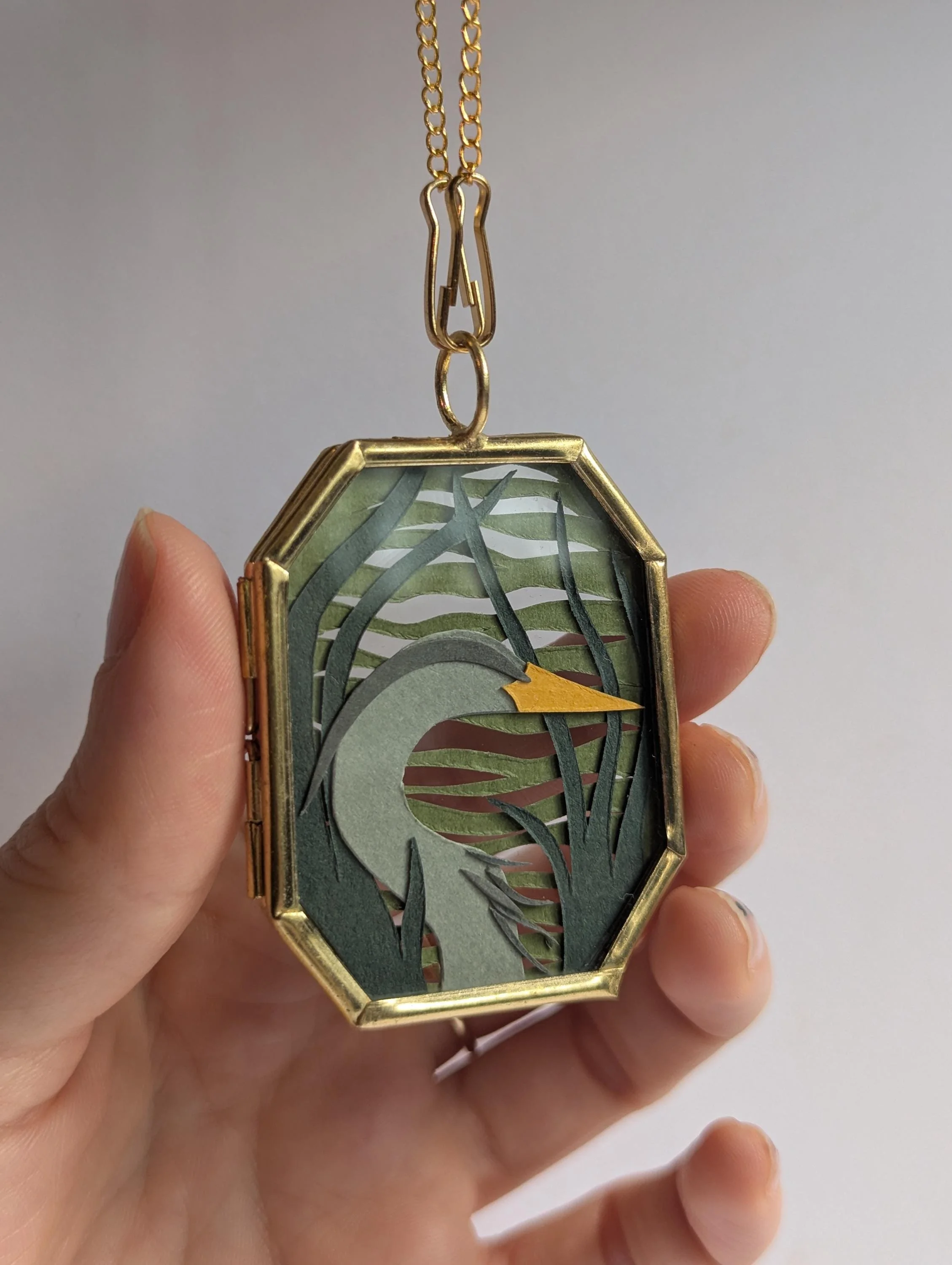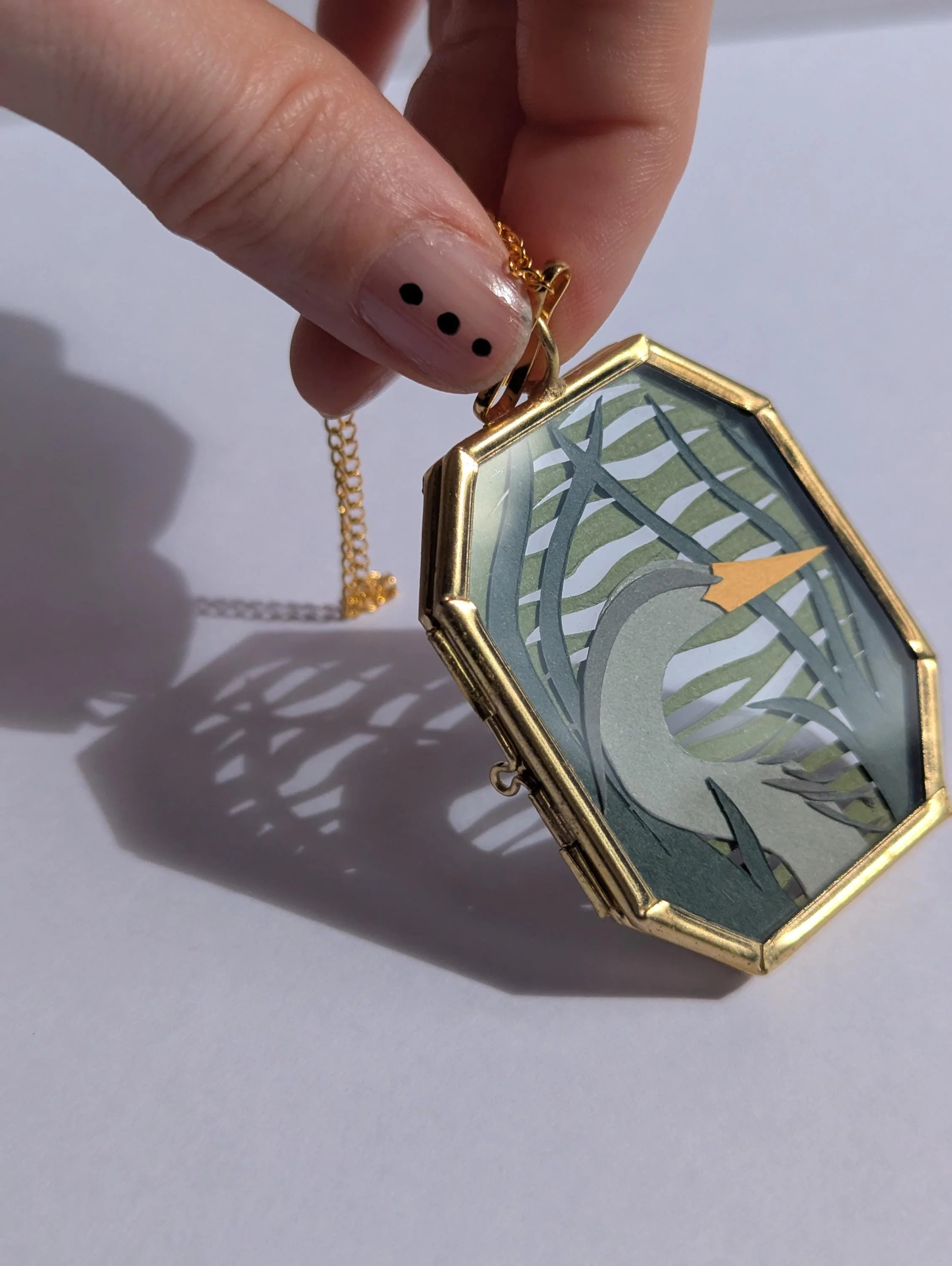 A paper-cut heron surrounded by tall grass, a little 2D paper scene inside a two-sided glass and brass hanging pendant.