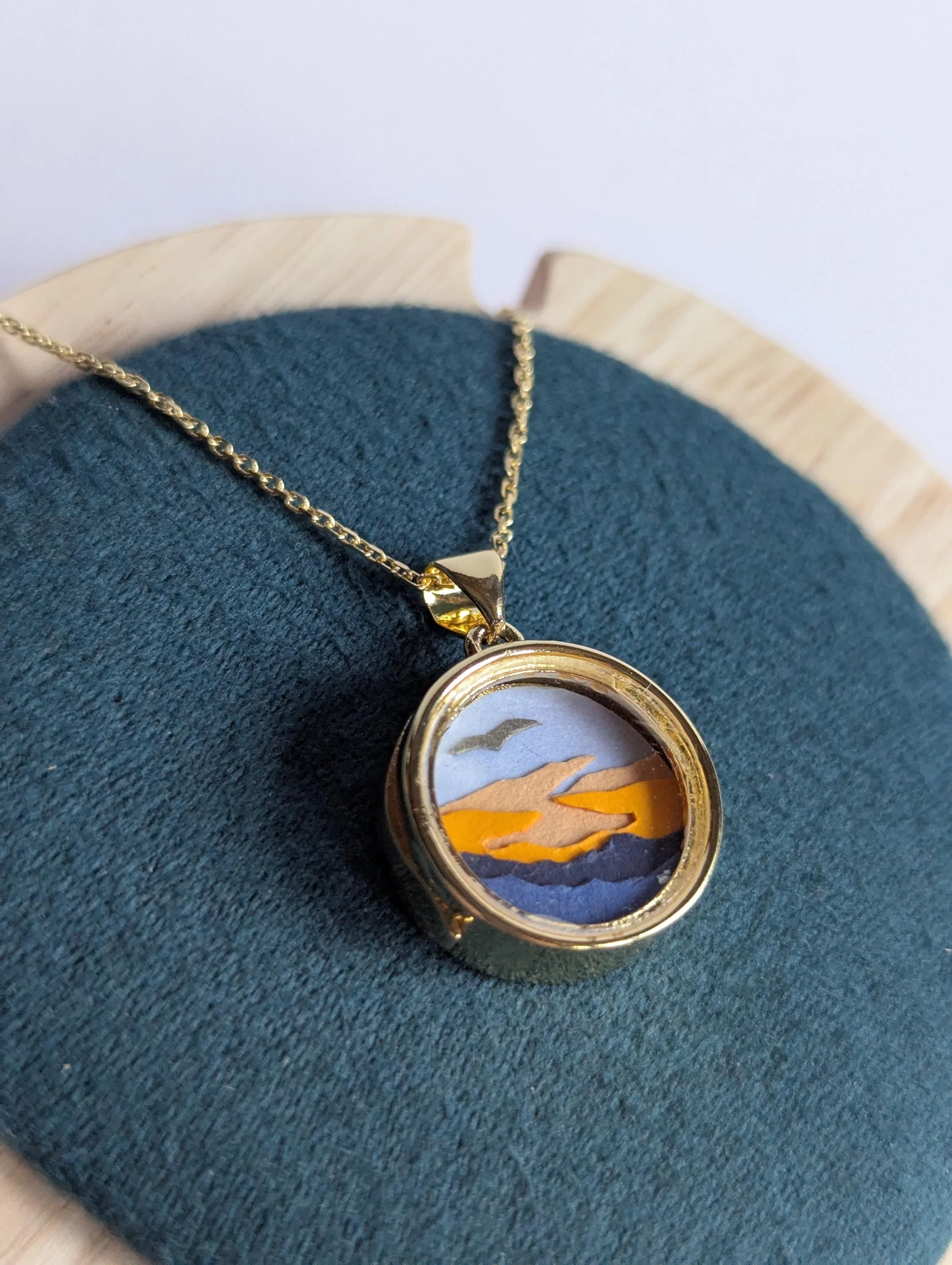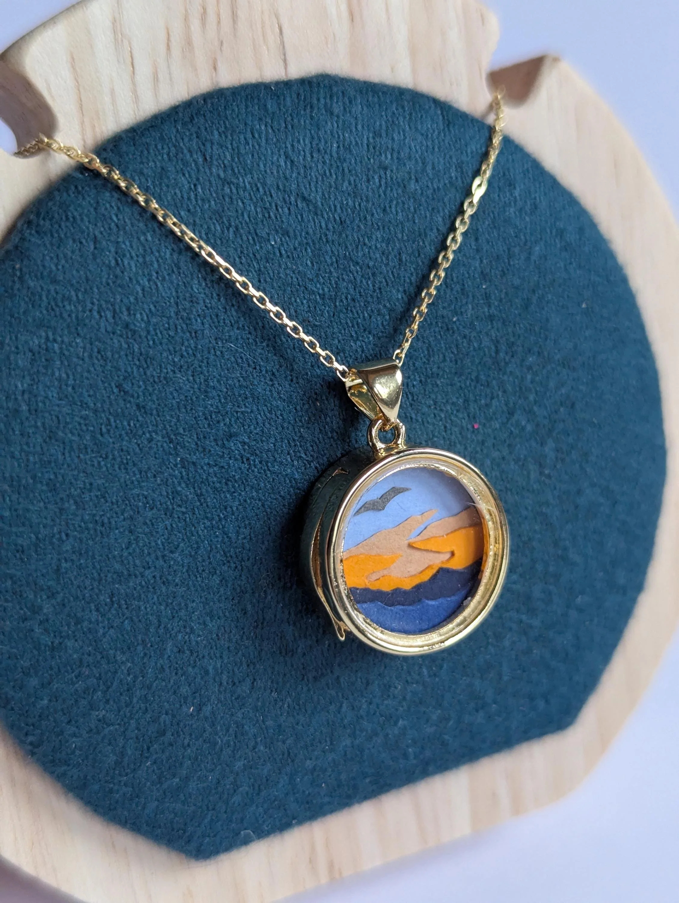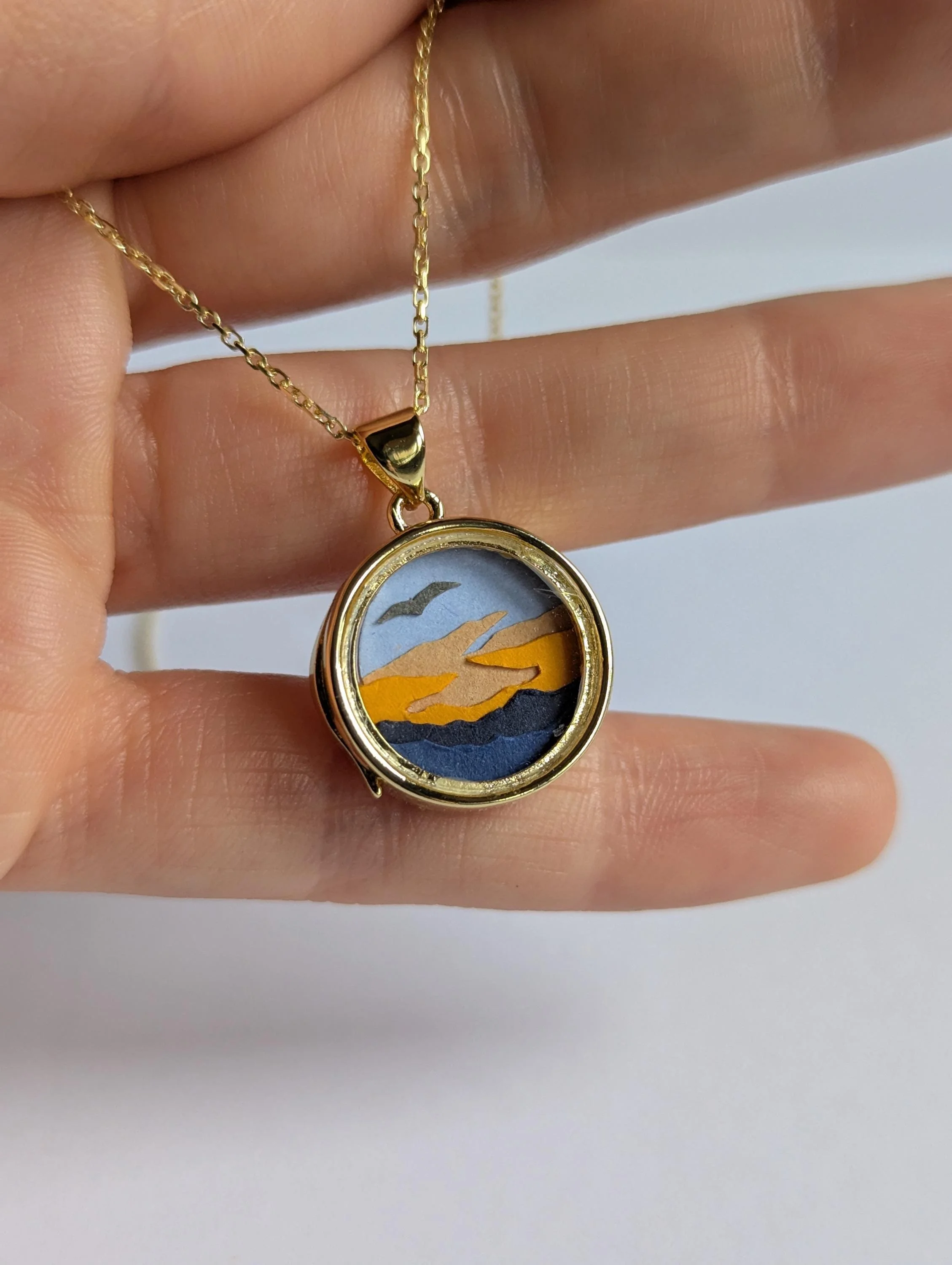 The pendant is 9ct gold filled and the chain is 9ct gold plated 925 sterling silver. So if given the right amount of care, the colour shouldn't fade. The locket has two glass panels on either side but the locket is not water tight so don't get the necklace wet to preserve the paper scenes inside the locket.