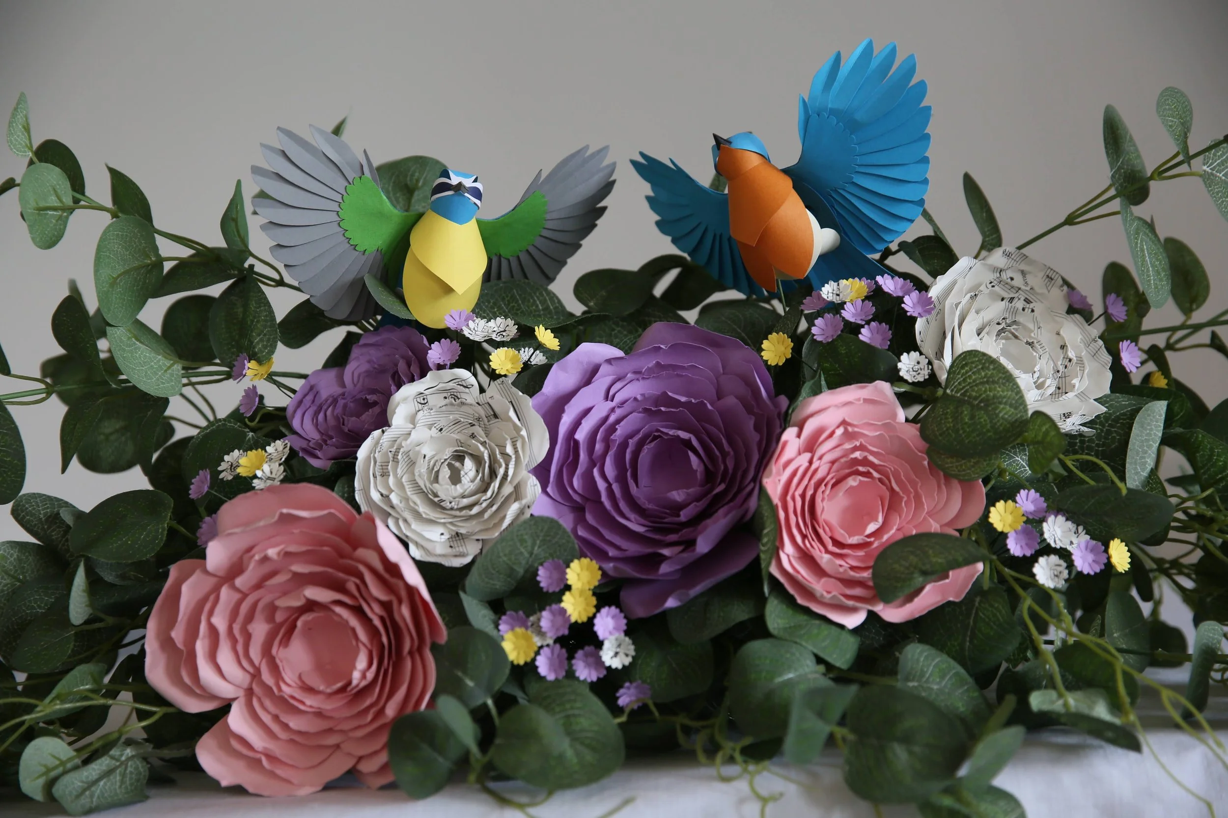 4 Extra Large Flowers, 4 Large Flowers, Filler Flowers, Leaves (Artificial), 2 of my signature birds for an added touch